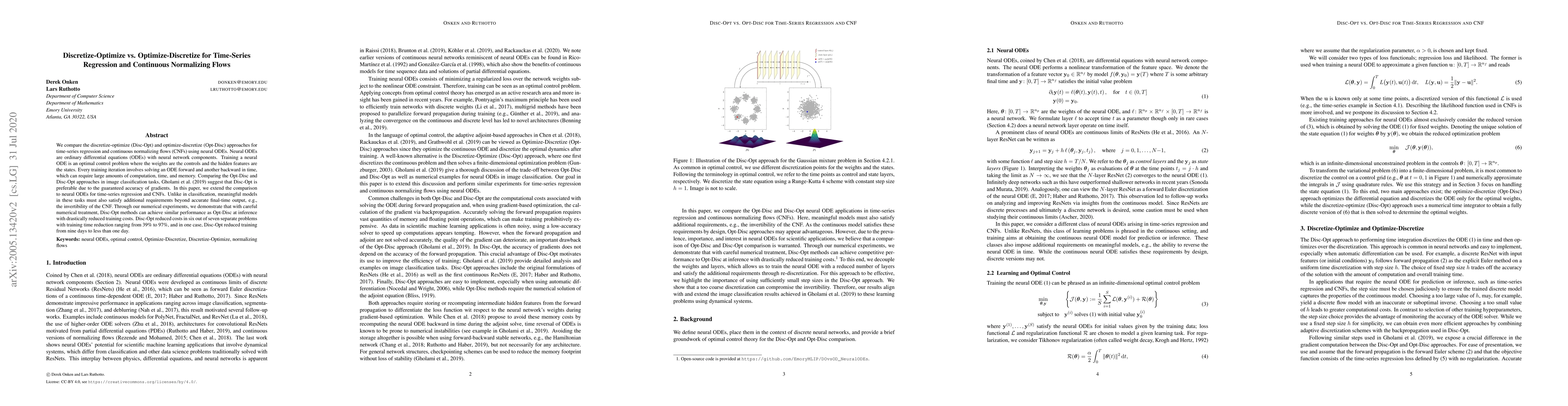 We compare the discretize-optimize (Disc-Opt) and optimize-discretize (Opt-Disc) approaches for time-series regression and continuous normalizing flows (CNFs) using neural ODEs. Neural ODEs are ordinary differential equations (ODEs) with neural network components. Training a neural ODE is an optimal control problem where the weights are the controls and the hidden features are the states. Every training iteration involves solving an ODE forward and another backward in time, which can require large amounts of computation, time, and memory. Comparing the Opt-Disc and Disc-Opt approaches in image classification tasks, Gholami et al. (2019) suggest that Disc-Opt is preferable due to the guaranteed accuracy of gradients. In this paper, we extend the comparison to neural ODEs for time-series regression and CNFs. Unlike in classification, meaningful models in these tasks must also satisfy additional requirements beyond accurate final-time output, e.g., the invertibility of the CNF. Through our numerical experiments, we demonstrate that with careful numerical treatment, Disc-Opt methods can achieve similar performance as Opt-Disc at inference with drastically reduced training costs. Disc-Opt reduced costs in six out of seven separate problems with training time reduction ranging from 39% to 97%, and in one case, Disc-Opt reduced training from nine days to less than one day.