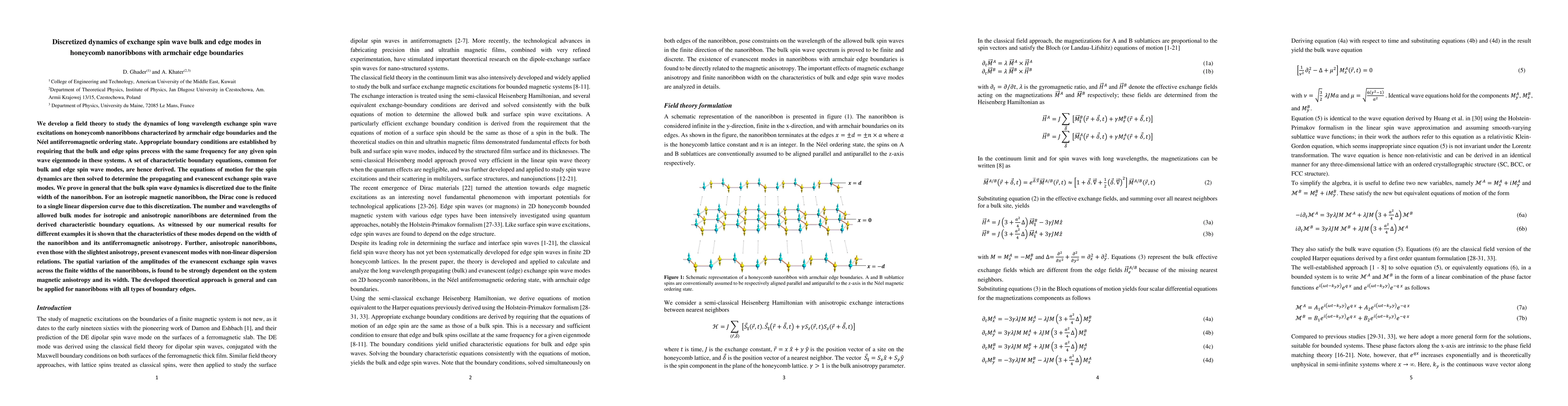 We develop a field theory to study the dynamics of long wavelength exchange spin wave excitations on honeycomb nanoribbons characterized by armchair edge boundaries and the N\'eel antiferromagnetic ordering state. Appropriate boundary conditions are established by requiring that the bulk and edge spins precess with the same frequency for any given spin wave eigenmode in these systems. A set of characteristic boundary equations, common for bulk and edge spin wave modes, are hence derived. The equations of motion for the spin dynamics are then solved to determine the propagating and evanescent exchange spin wave modes. We prove in general that the bulk spin wave dynamics is discretized due to the finite width of the nanoribbon. For an isotropic magnetic nanoribbon, the Dirac cone is reduced to a single linear dispersion curve due to this discretization. The number and wavelengths of allowed bulk modes for isotropic and anisotropic nanoribbons are determined from the derived characteristic boundary equations. As witnessed by our numerical results for different examples it is shown that the characteristics of these modes depend on the width of the nanoribbon and its antiferromagnetic anisotropy. Further, anisotropic nanoribbons, even those with the slightest anisotropy, present evanescent modes with non-linear dispersion relations. The spatial variation of the amplitudes of the evanescent exchange spin waves across the finite widths of the nanoribbons, is found to be strongly dependent on the system magnetic anisotropy and its width. The developed theoretical approach is general and can be applied for nanoribbons with all types of boundary edges.