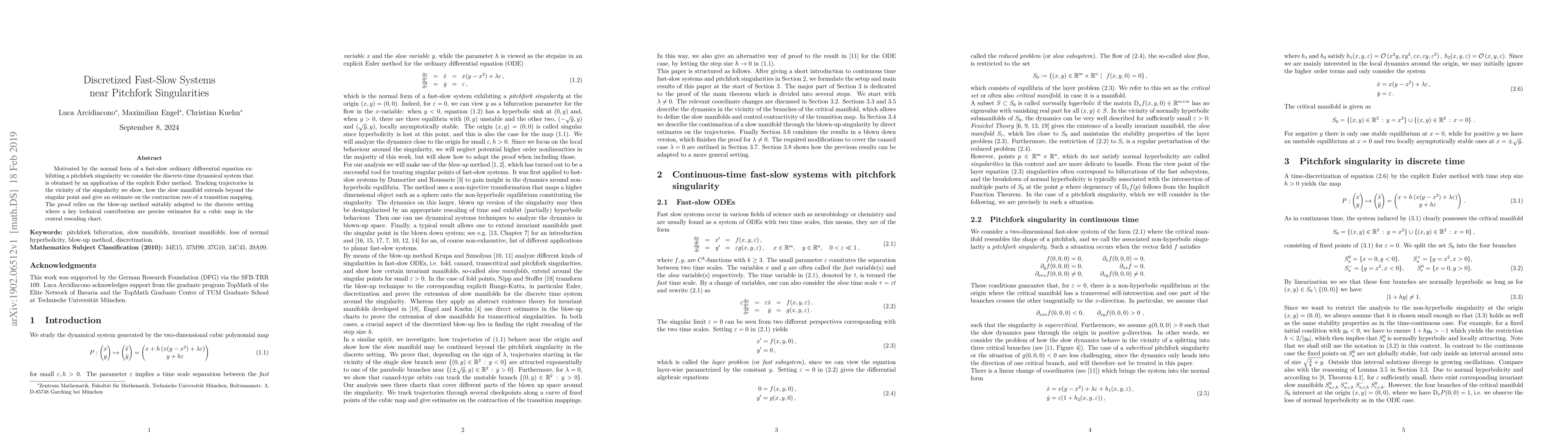 Motivated by the normal form of a fast-slow ordinary differential equation exhibiting a pitchfork singularity we consider the discrete-time dynamical system that is obtained by an application of the explicit Euler method. Tracking trajectories in the vicinity of the singularity we show, how the slow manifold extends beyond the singular point and give an estimate on the contraction rate of a transition mapping. The proof relies on the blow-up method suitably adapted to the discrete setting where a key technical contribution are precise estimates for a cubic map in the central rescaling chart.