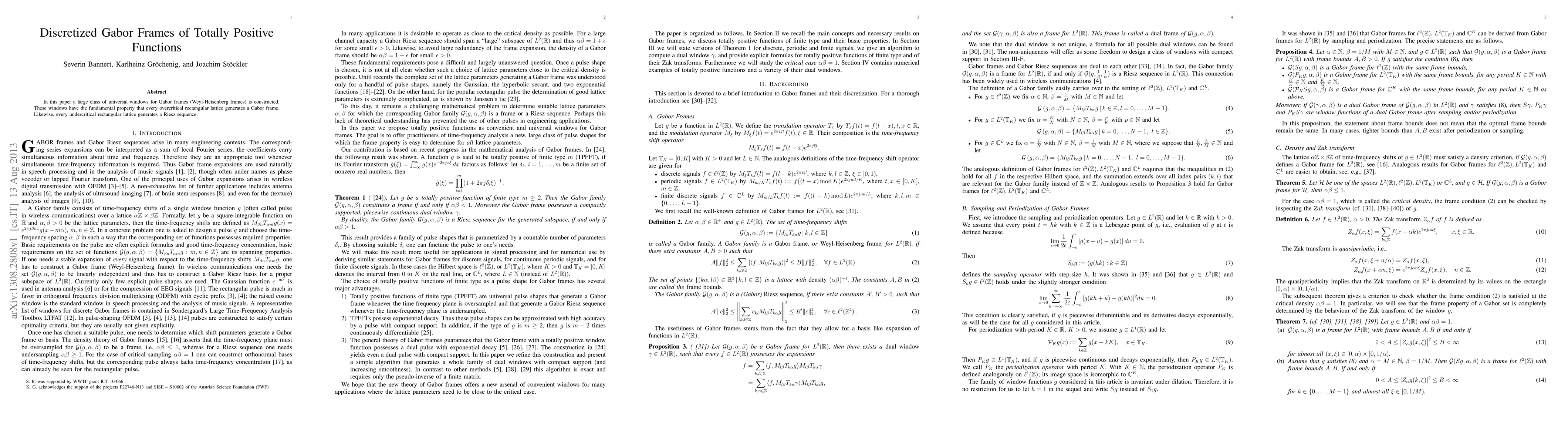 This paper constructs a broad class of universal windows for Gabor frames, ensuring that any overcritical rectangular lattice forms a Gabor frame, while undercritical lattices generate Riesz sequences. The focus is on totally positive functions and their discretized Gabor frames.