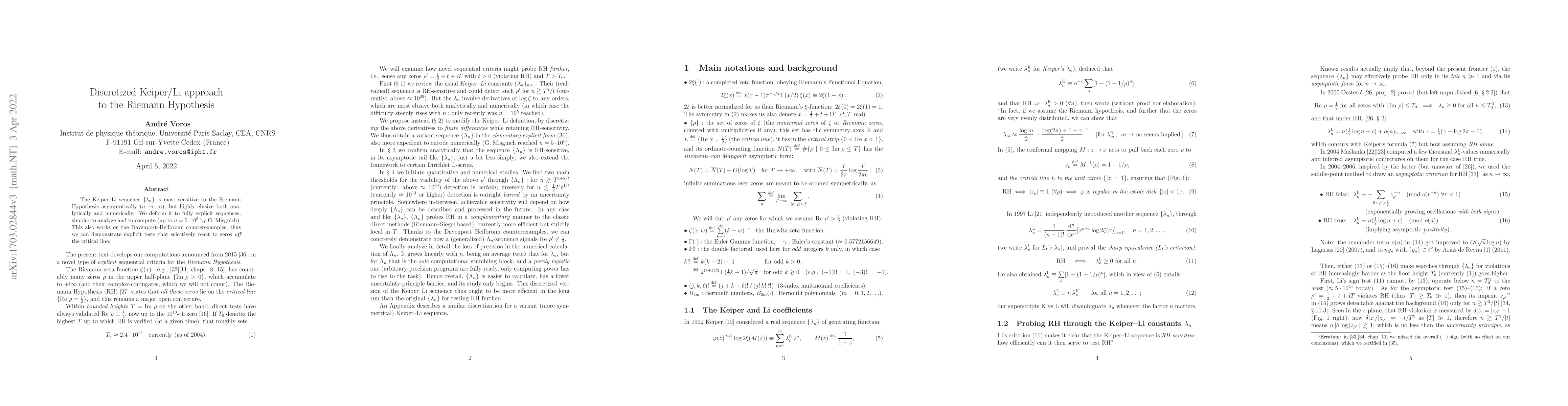 The Keiper--Li sequence $\{ \lambda_n \}$ is most sensitive to the Riemann Hypothesis asymptotically ($n \to \infty$), but highly elusive both analytically and numerically. We deform it to fully explicit sequences, simpler to analyze and to compute (up to $n=5 \cdot 10^5$ by G. Misguich). This also works on the Davenport--Heilbronn counterexamples, thus we can demonstrate explicit tests that selectively react to zeros off the critical line.