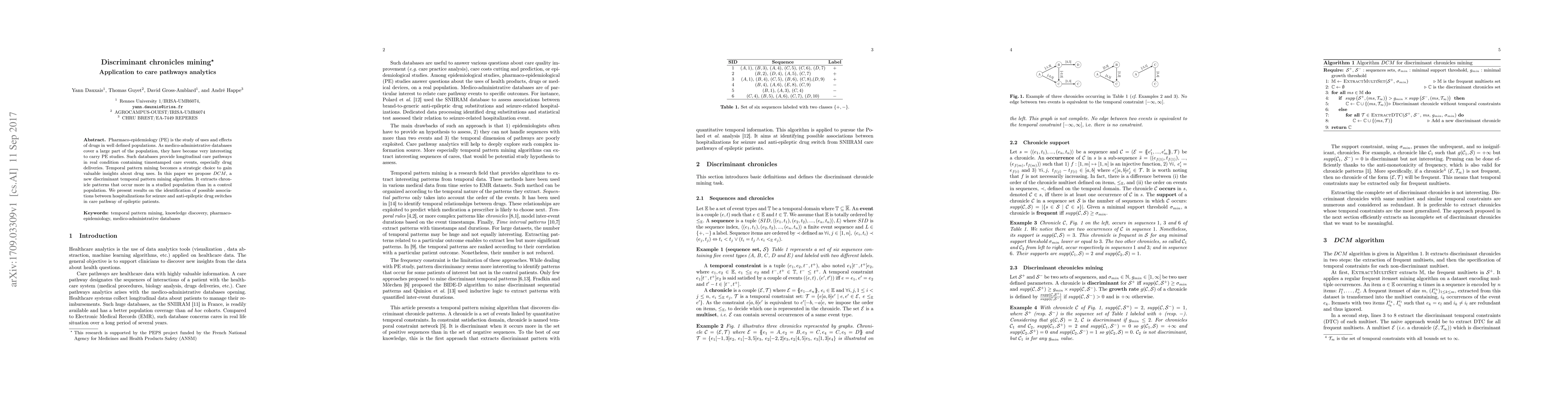 This paper introduces DCM, a novel discriminant temporal pattern mining algorithm designed to identify significant chronicle patterns in pharmaco-epidemiology studies. The algorithm extracts patterns occurring more frequently in a study population compared to a control group, demonstrating its application in analyzing care pathways for epileptic patients to identify associations between hospitalizations for seizures and anti-epileptic drug switches.