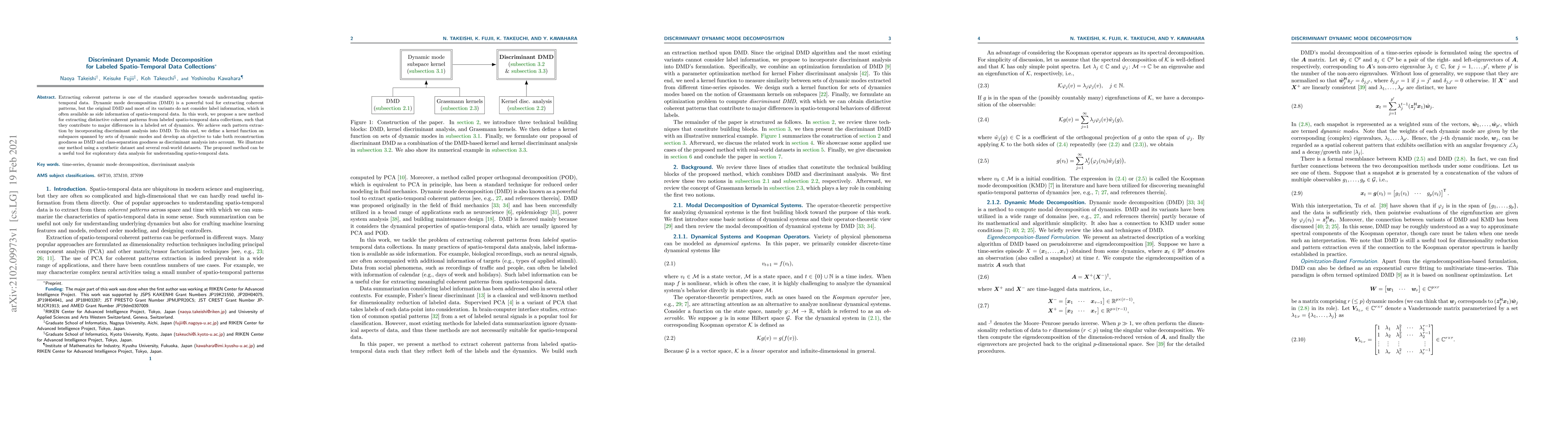 The research introduces Discriminant Dynamic Mode Decomposition (DMD) for extracting distinctive coherent patterns from labeled spatio-temporal data collections by incorporating discriminant analysis into DMD. It defines a kernel function on subspaces spanned by sets of dynamic modes and develops an objective to balance reconstruction goodness (DMD) and class-separation goodness (discriminant analysis).