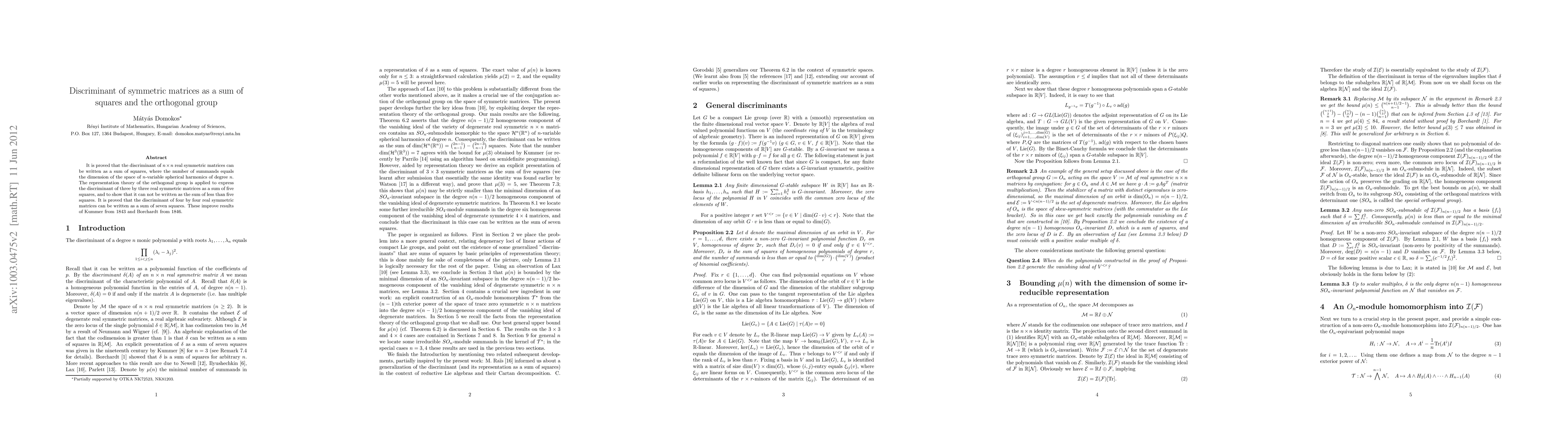 This paper proves that the discriminant of real symmetric matrices can be expressed as a sum of squares, with the number of squares corresponding to the dimension of the space of spherical harmonics. It specifically shows that the discriminant of 3x3 matrices can be represented as five squares and that four by four matrices require seven squares, improving upon historical results from Kummer and Borchardt.