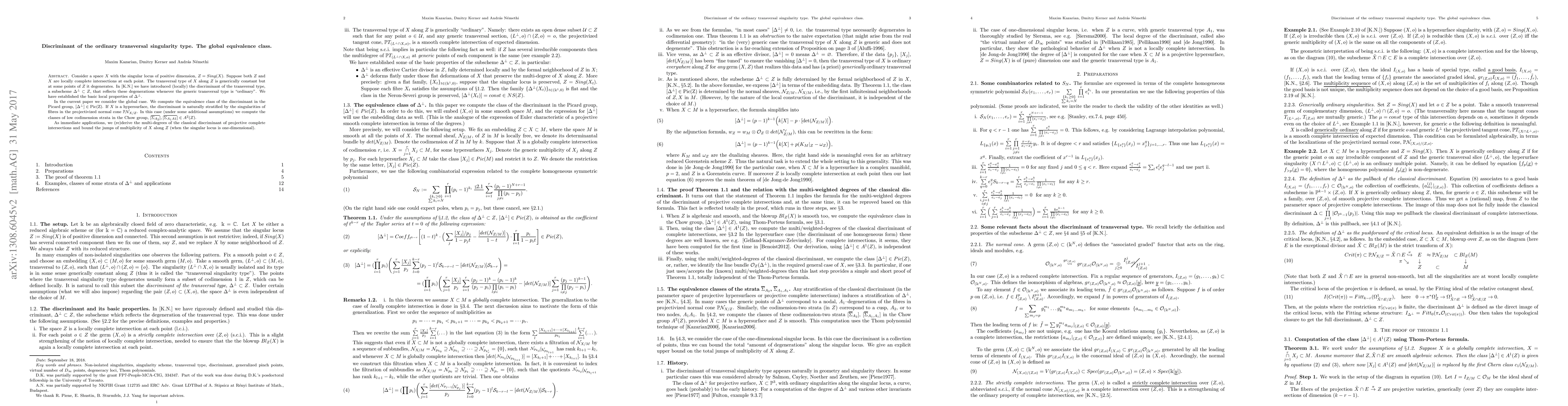 Consider a space X with the singular locus of positive dimension, Z=Sing(X). Suppose both Z and X are locally complete intersections at each point. The transversal type of X along Z is generically constant but at some points of Z it degenerates. In the previous work we have introduced (locally) the discriminant of the transversal type, a subscheme of Z, that reflects these degenerations whenever the generic transversal type is "ordinary". We have established the basic local properties of the discriminant. In the current paper we consider the global case. We compute the equivalence class of the discriminant in the Picard group, Pic(Z). If $X$ is a hypersurface, the discriminant is naturally stratified by the singularities of fibres in the projectivized normal cone $\mathbb{P}$N$_{X/Z}$. In this case (under some additional assumptions) we compute the classes of low codimension strata in the Chow group, A$^2$(Z). As immediate applications, we (re)derive the multi-degrees of the classical discriminant of projective complete intersections and bound the jumps of multiplicity of X along Z (when the singular locus is one-dimensional).