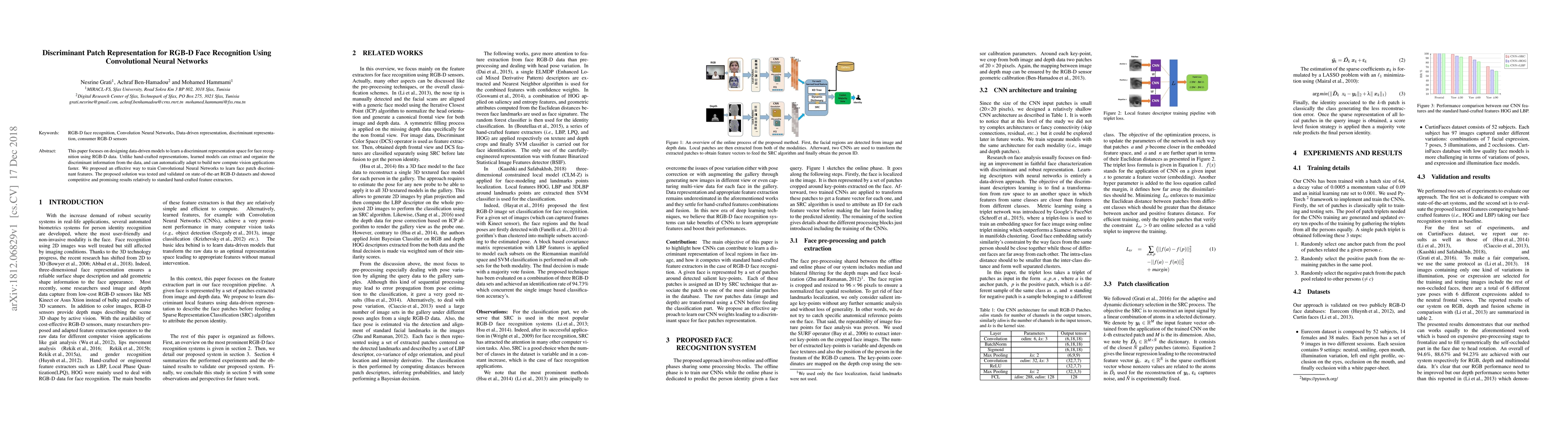 This paper proposes a Convolutional Neural Network (CNN) model to learn discriminant patch representations for RGB-D face recognition, demonstrating competitive results against traditional hand-crafted feature extractors on benchmark datasets. The learned model automatically adapts to new compute vision applications.