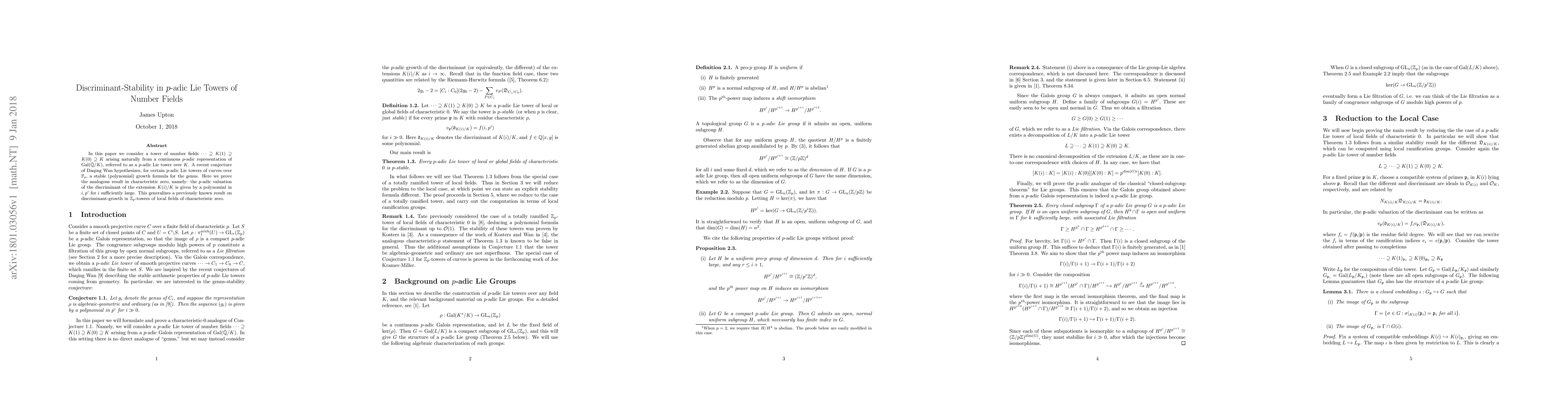 In this paper we consider a tower of number fields $\cdots \supseteq K(1) \supseteq K(0) \supseteq K$ arising naturally from a continuous $p$-adic representation of $\mathrm{Gal}(\bar{\mathbb{Q}}/K)$, referred to as a $p$-adic Lie tower over $K$. A recent conjecture of Daqing Wan hypothesizes, for certain $p$-adic Lie towers of curves over $\mathbb{F}_p$, a stable (polynomial) growth formula for the genus. Here we prove the analogous result in characteristic zero, namely: the $p$-adic valuation of the discriminant of the extension $K(i)/K$ is given by a polynomial in $i,p^i$ for $i$ sufficiently large. This generalizes a previously known result on discriminant-growth in $\mathbb{Z}_p$-towers of local fields of characteristic zero.