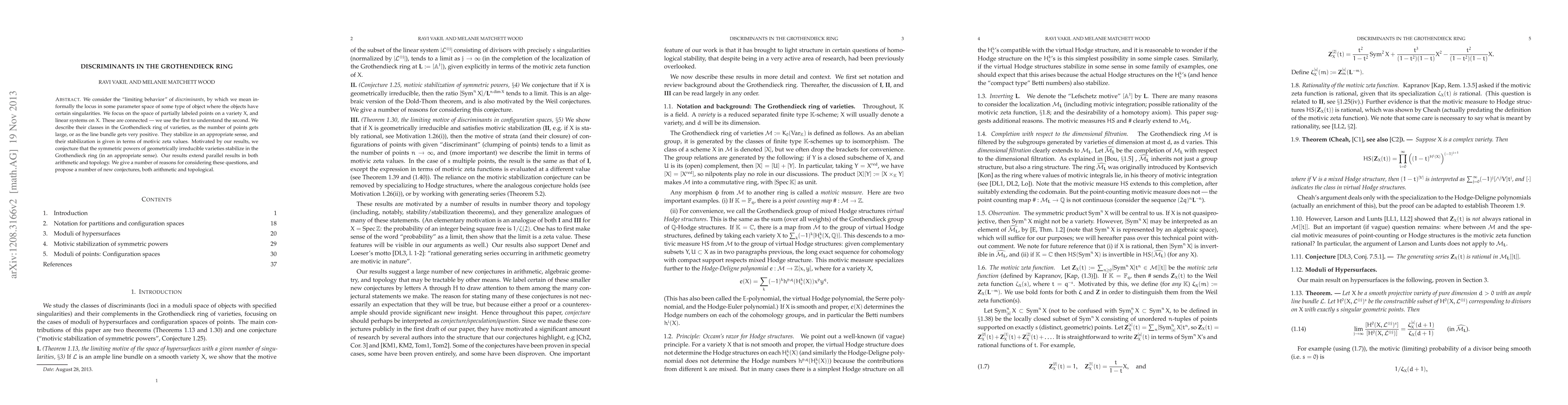 We consider the "limiting behavior" of *discriminants*, by which we mean informally the locus in some parameter space of some type of object where the objects have certain singularities. We focus on the space of partially labeled points on a variety X, and linear systems on X. These are connected --- we use the first to understand the second. We describe their classes in the Grothendieck ring of varieties, as the number of points gets large, or as the line bundle gets very positive. They stabilize in an appropriate sense, and their stabilization is given in terms of motivic zeta values. Motivated by our results, we conjecture that the symmetric powers of geometrically irreducible varieties stabilize in the Grothendieck ring (in an appropriate sense). Our results extend parallel results in both arithmetic and topology. We give a number of reasons for considering these questions, and propose a number of new conjectures, both arithmetic and topological.