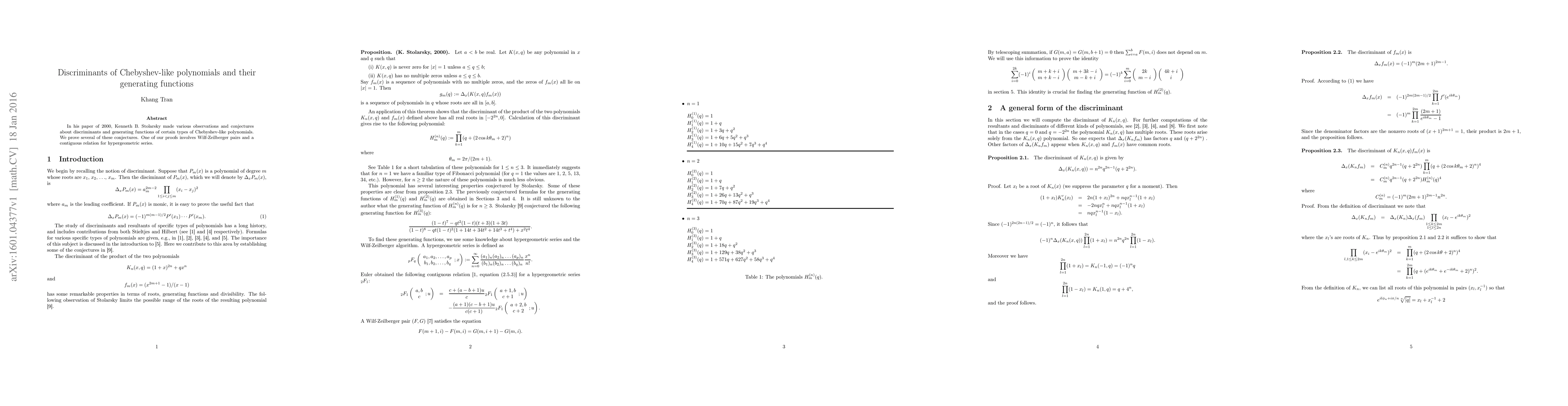 Summary: This paper proves several conjectures by Kenneth B. Stolarsky regarding discriminants and generating functions of Chebyshev-like polynomials, employing Wilf-Zeilberger pairs and hypergeometric series contiguous relations in the proofs.