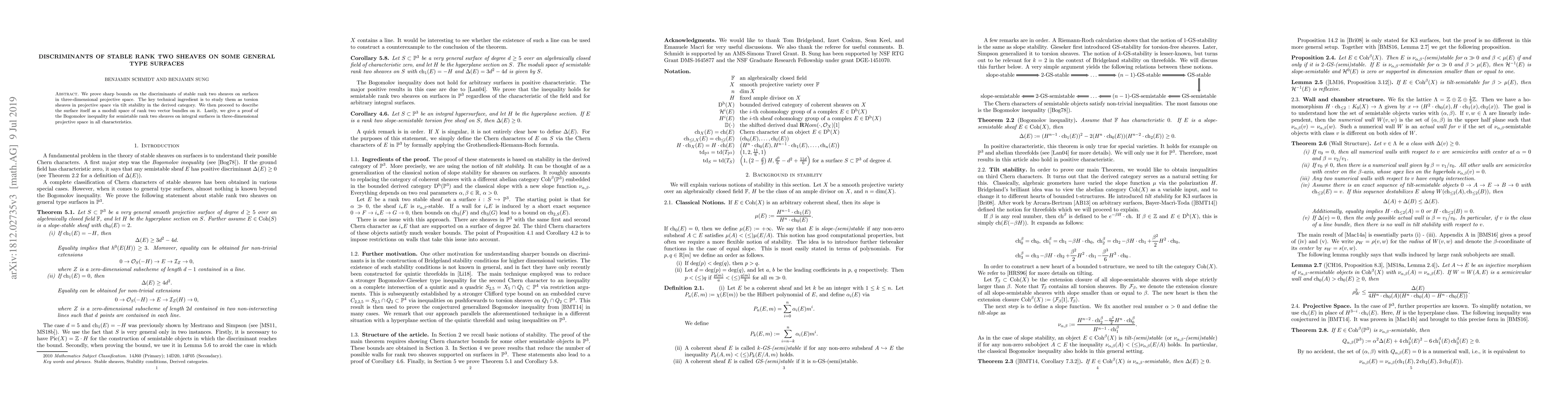 Summary: This paper establishes sharp bounds for the discriminants of stable rank two sheaves on general type surfaces in projective space, using tilt stability and derives a proof for the Bogomolov inequality for semistable rank two sheaves on such surfaces.