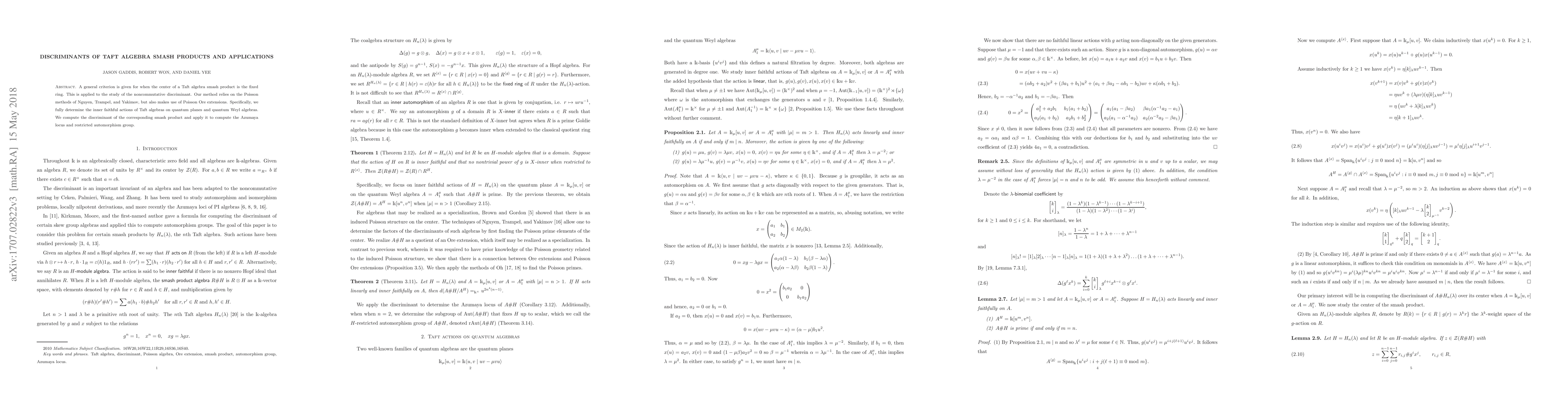 This research establishes a general criterion for when the center of a Taft algebra smash product equals the fixed ring, applying it to the noncommutative discriminant. Utilizing Poisson methods and Ore extensions, it fully determines inner faithful actions of Taft algebras on quantum planes and Weyl algebras, computing the discriminant and applying it to Azumaya loci and restricted automorphism groups.