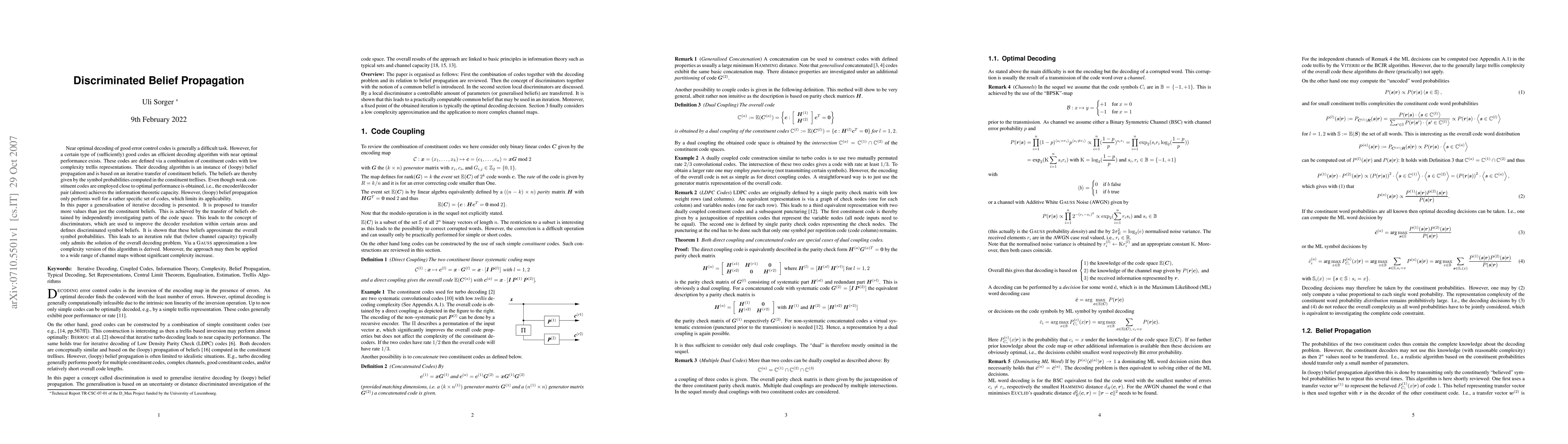 Near optimal decoding of good error control codes is generally a difficult task. However, for a certain type of (sufficiently) good codes an efficient decoding algorithm with near optimal performance exists. These codes are defined via a combination of constituent codes with low complexity trellis representations. Their decoding algorithm is an instance of (loopy) belief propagation and is based on an iterative transfer of constituent beliefs. The beliefs are thereby given by the symbol probabilities computed in the constituent trellises. Even though weak constituent codes are employed close to optimal performance is obtained, i.e., the encoder/decoder pair (almost) achieves the information theoretic capacity. However, (loopy) belief propagation only performs well for a rather specific set of codes, which limits its applicability. In this paper a generalisation of iterative decoding is presented. It is proposed to transfer more values than just the constituent beliefs. This is achieved by the transfer of beliefs obtained by independently investigating parts of the code space. This leads to the concept of discriminators, which are used to improve the decoder resolution within certain areas and defines discriminated symbol beliefs. It is shown that these beliefs approximate the overall symbol probabilities. This leads to an iteration rule that (below channel capacity) typically only admits the solution of the overall decoding problem. Via a Gauss approximation a low complexity version of this algorithm is derived. Moreover, the approach may then be applied to a wide range of channel maps without significant complexity increase.