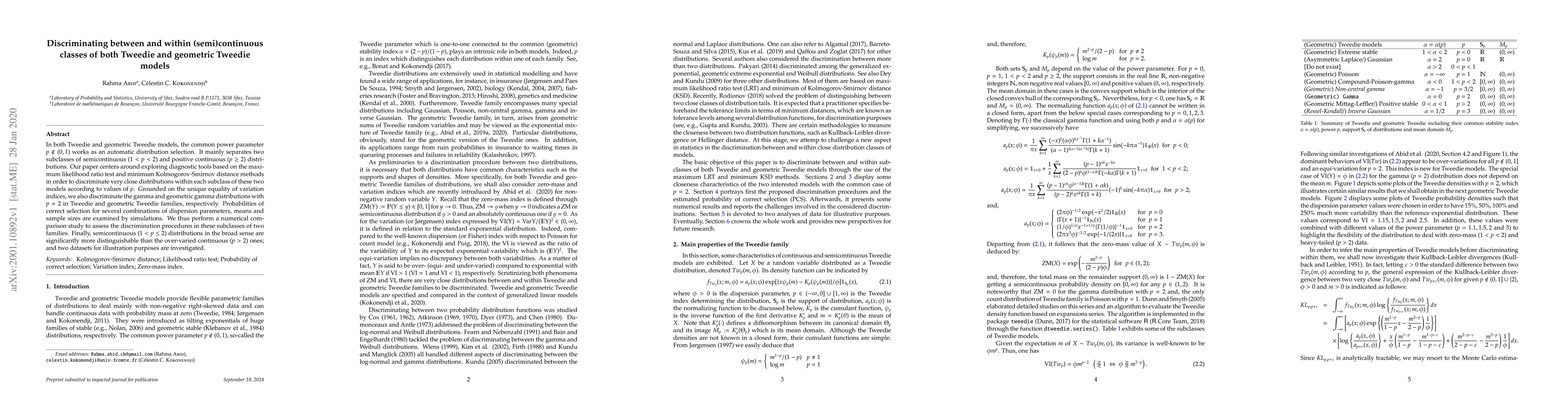 Researchers developed diagnostic tools to distinguish between and within distributions in Tweedie and geometric Tweedie models based on power parameter p, leading to improved classification of semicontinuous and continuous distributions.