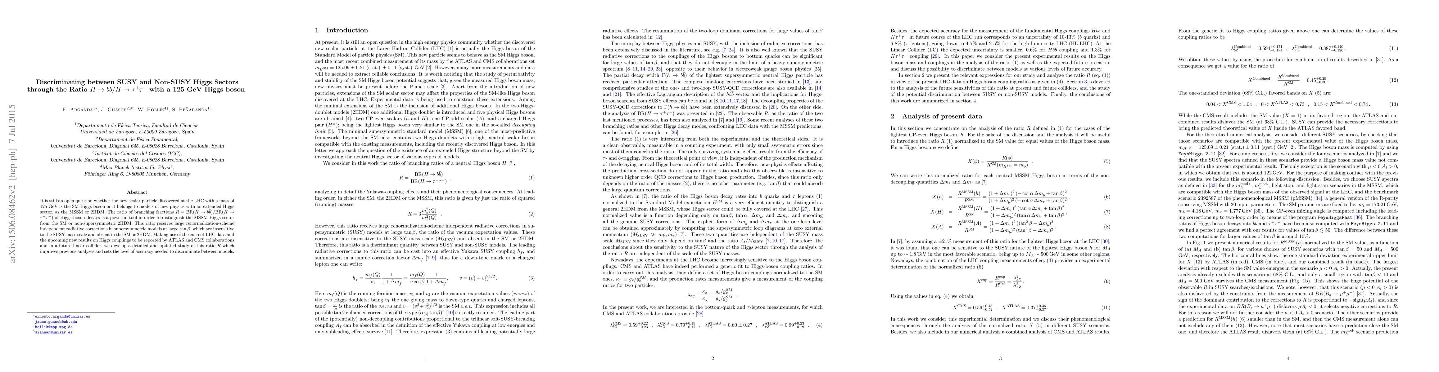 This paper investigates the ratio $R$ = BR($H \to b \bar b$)/BR($H \to \tau^+ \tau^-$) to distinguish between SUSY and non-SUSY Higgs sectors, finding significant differences in supersymmetric models at large $\tan\beta$ compared to the Standard Model or non-supersymmetric 2HDM. The study aims to improve accuracy in discriminating between these models using current LHC data and future results.
