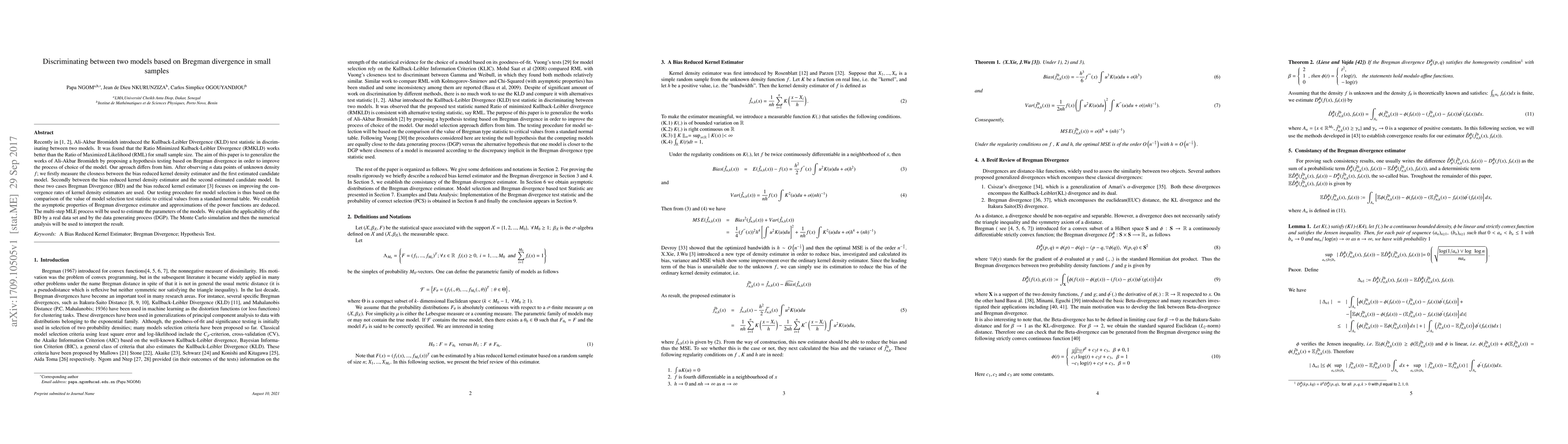 This paper proposes a new hypothesis testing method based on Bregman divergence to discriminate between two models, especially for small sample sizes. It improves upon previous methods by using bias-reduced kernel density estimators and comparing divergence values to critical values from a standard normal table, with simulations and real data analysis to demonstrate its effectiveness.