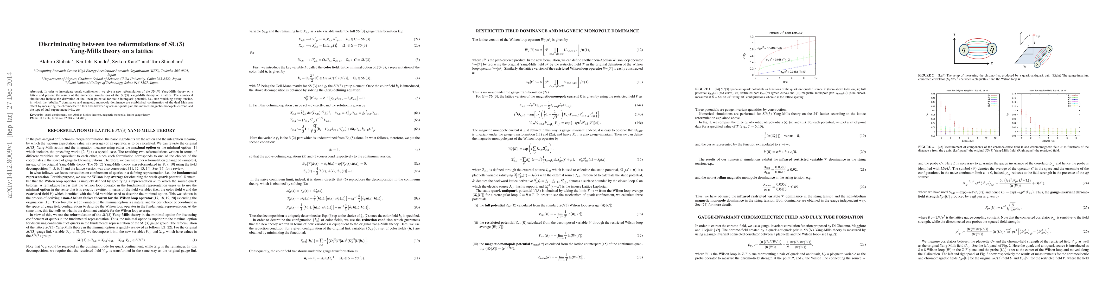 This paper reformulates $SU(3)$ Yang-Mills theory on a lattice to study quark confinement, deriving a linear potential for static interquark interactions and confirming the dual Meissner effect through measurements of chromoelectric flux tubes and magnetic monopole dominance.