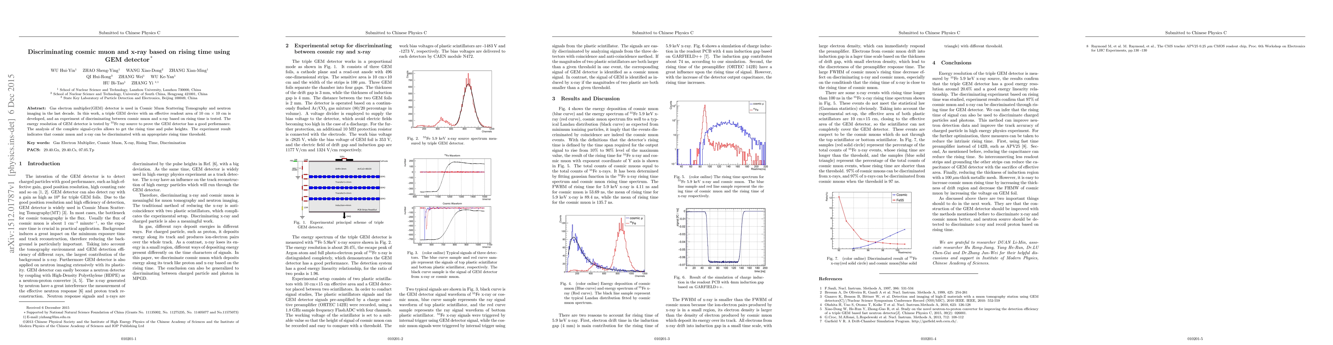This paper develops a triple GEM detector to discriminate between cosmic muons and x-rays based on rising time analysis. Experimental results show that setting an appropriate rising time threshold effectively distinguishes the two particle types.