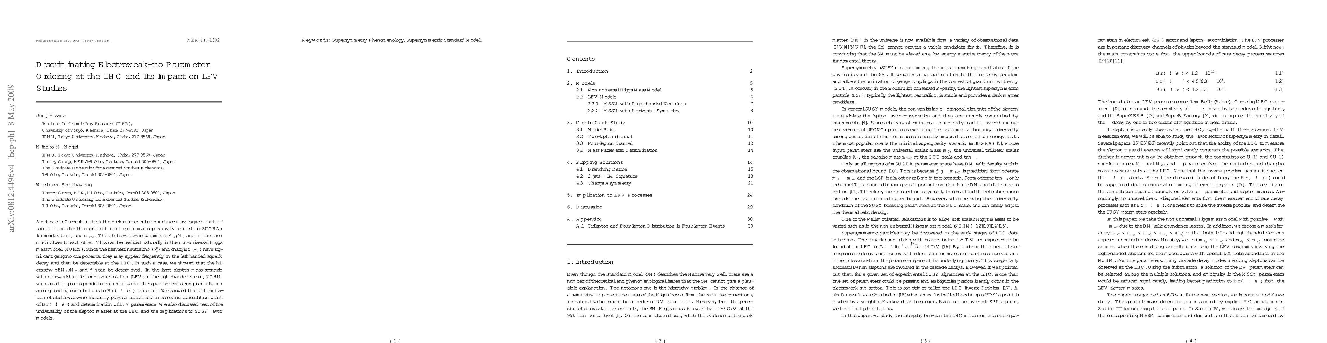 Current limit on the dark matter relic abundance may suggest that $|\mu|$ should be smaller than prediction in the minimal supergravity scenario (mSUGRA) for moderate $m_0$ and $m_{1/2}$. The electroweak-ino parameter $M_1, M_2$ and $|\mu|$ are then much closer to each other. This can be realized naturally in the non-universal Higgs mass model (NUHM). Since the heaviest neutralino ($\tilde\chi^0_4$) and chargino ($\tilde\chi^\pm_2$) have significant gaugino components, they may appear frequently in the left-handed squark decay and then be detectable at the LHC. In such a case, we showed that the hierarchy of $M_1, M_2$ and $|\mu|$ can be determined. In the light slepton mass scenario with non-vanishing lepton-flavor violation (LFV) in the right-handed sector, NUHM with small $|\mu|$ corresponds to region of parameter space where strong cancellation among leading contributions to $Br(\mu\to e\gamma)$ can occur. We showed that determination of electroweak-ino hierarchy plays a crucial role in resolving cancellation point of $Br(\mu\to e\gamma)$ and determination of LFV parameters. We also discussed test of the universality of the slepton masses at the LHC and the implications to SUSY flavor models.