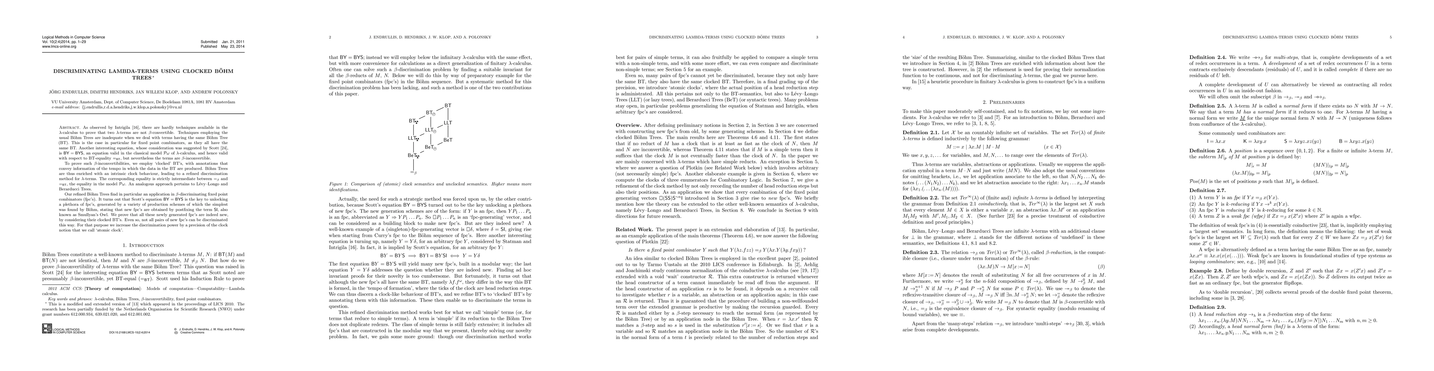 This paper introduces "clocked" Boehm Trees to discriminate lambda-terms that are not beta-convertible despite sharing the same Boehm Tree. By annotating Boehm Trees with tempo information, it refines the discrimination method, especially for fixed point combinators, and proves the uniqueness of newly generated combinators using enhanced "atomic clock" precision.