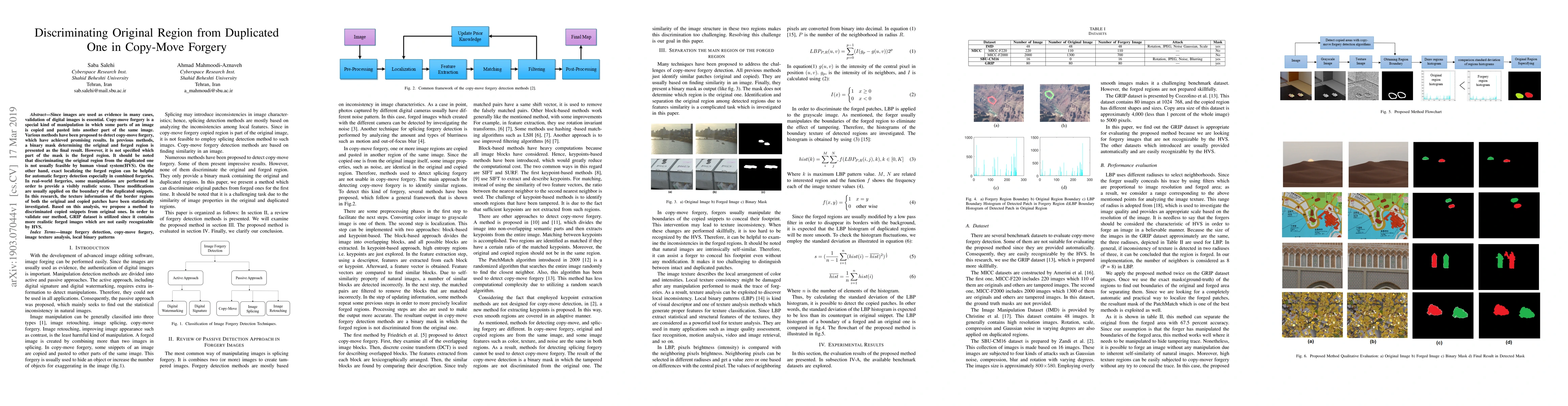 Since images are used as evidence in many cases, validation of digital images is essential. Copy-move forgery is a special kind of manipulation in which some parts of an image is copied and pasted into another part of the same image. Various methods have been proposed to detect copy-move forgery, which have achieved promising results. In previous methods, a binary mask determining the original and forged region is presented as the final result. However, it is not specified which part of the mask is the forged region. It should be noted that discriminating the original region from the duplicated one is not usually feasible by human visual system(HVS). On the other hand, exact localizing the forged region can be helpful for automatic forgery detection especially in combined forgeries. In real-world forgeries, some manipulations are performed in order to provide a visibly realistic scene. These modifications are usually applied on the boundary of the duplicated snippets. In this research, the texture information of the border regions of both the original and copied patches have been statistically investigated. Based on this analysis, we propose a method to discriminated copied snippets from original ones. In order to validate our method, GRIP dataset is utilized since it contains more realistic forged images which are not easily recognizable by HVS.