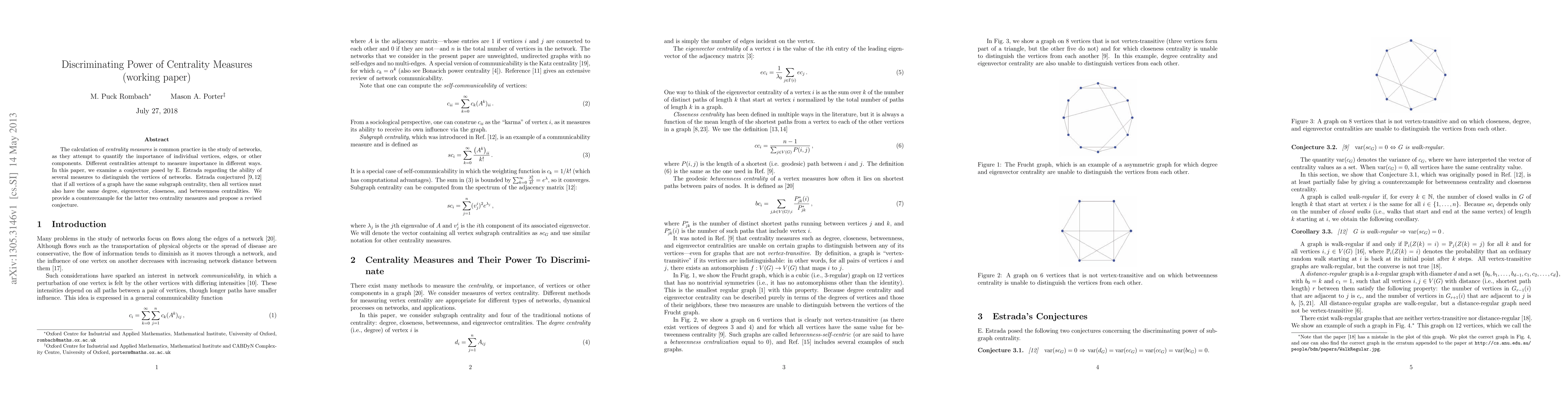 This paper challenges Estrada's conjecture about centrality measures in network analysis, providing a counterexample for eigenvector and betweenness centrality. It proposes a revised conjecture, highlighting the distinct discriminating powers of various centrality measures.