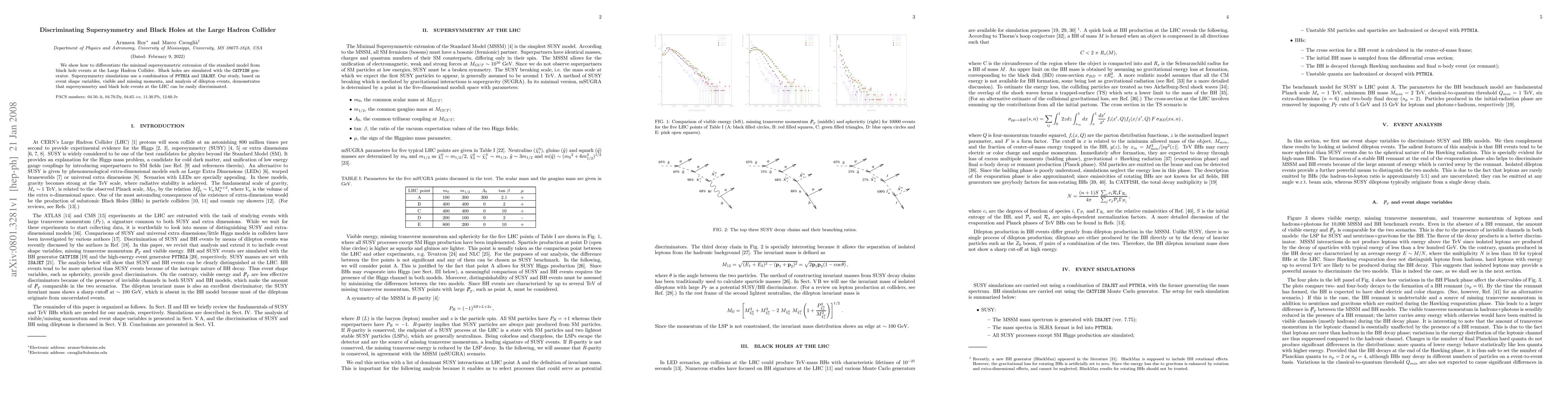This paper explores distinguishing minimal supersymmetric model events from black hole events at the LHC using event shape variables, visible and missing momenta, and dilepton event analysis. Simulations show that these techniques effectively differentiate between supersymmetry and black hole signals.