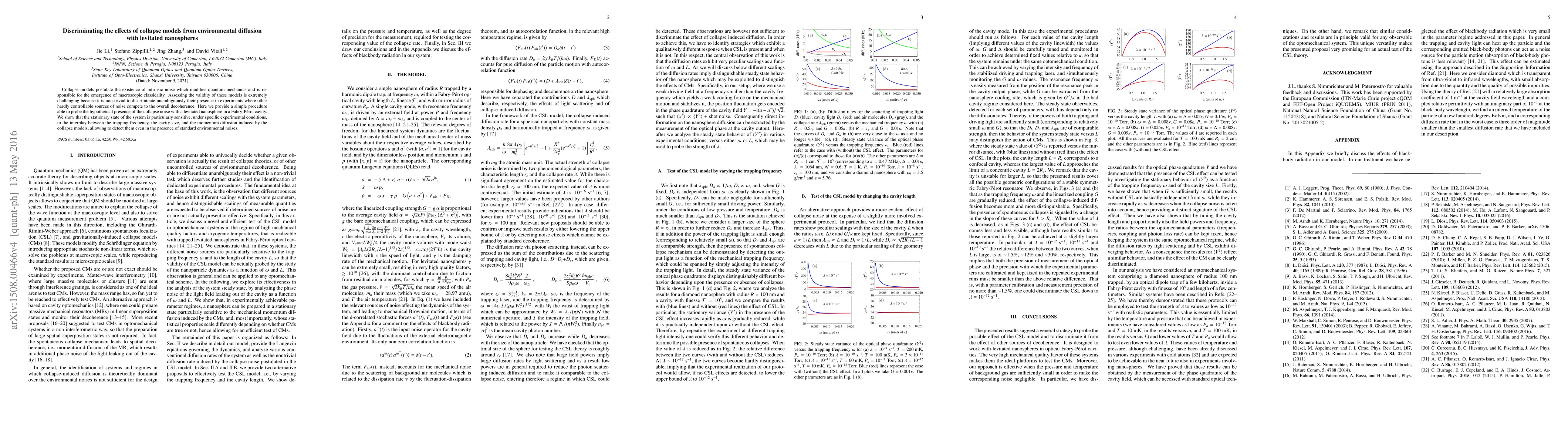 This paper proposes a method to distinguish the effects of collapse models from environmental diffusion using levitated nanospheres in a Fabry-Perot cavity. The study finds that under specific conditions, the stationary state of the system is sensitive to the interplay between the trapping frequency, cavity size, and momentum diffusion, enabling the detection of collapse models amidst standard environmental noise.