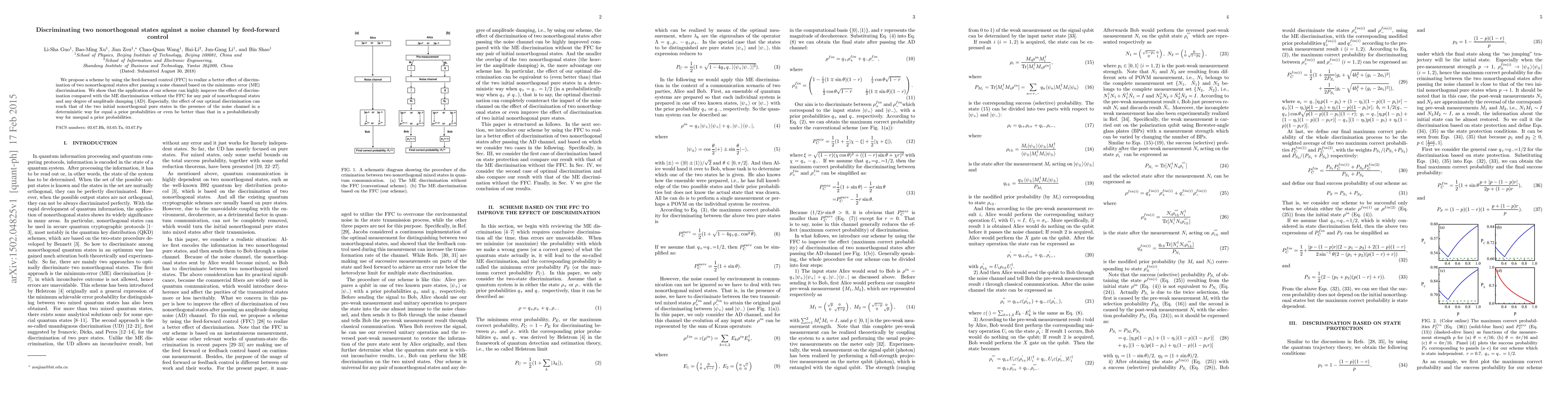 This paper proposes a feed-forward control (FFC) scheme to enhance the discrimination of two nonorthogonal quantum states after they pass through a noise channel, achieving near-optimal discrimination performance. The FFC method significantly improves discrimination effectiveness compared to minimum-error discrimination without FFC, even under amplitude damping conditions.