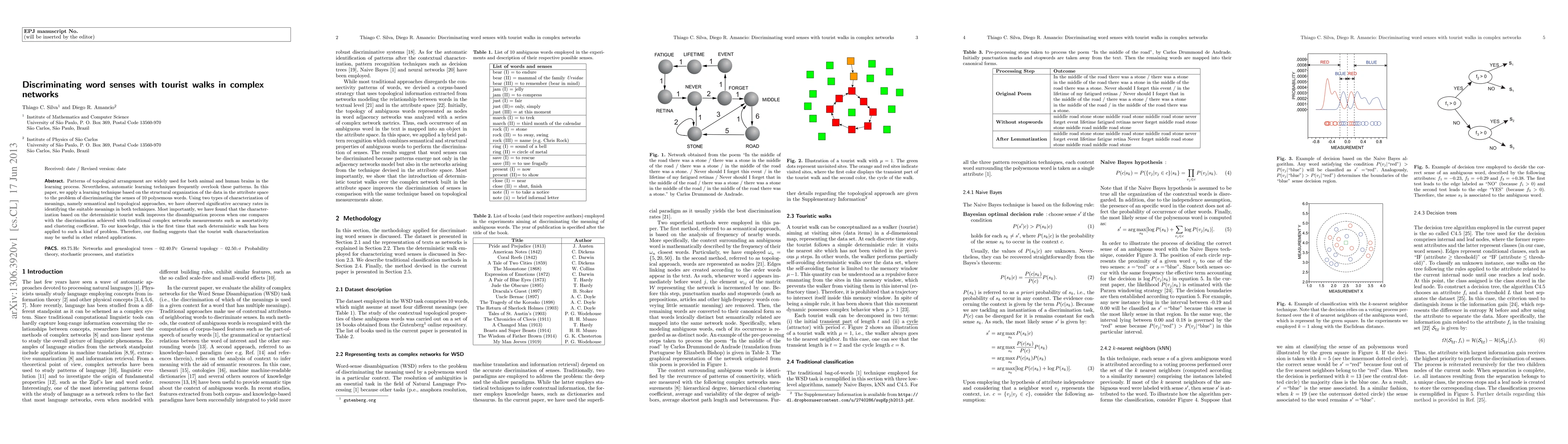 This paper introduces a novel learning technique based on deterministic tourist walks in complex networks to discriminate the senses of 10 polysemous words. The method shows significant accuracy, outperforming traditional network measurements, suggesting its potential utility in other semantic disambiguation tasks.
