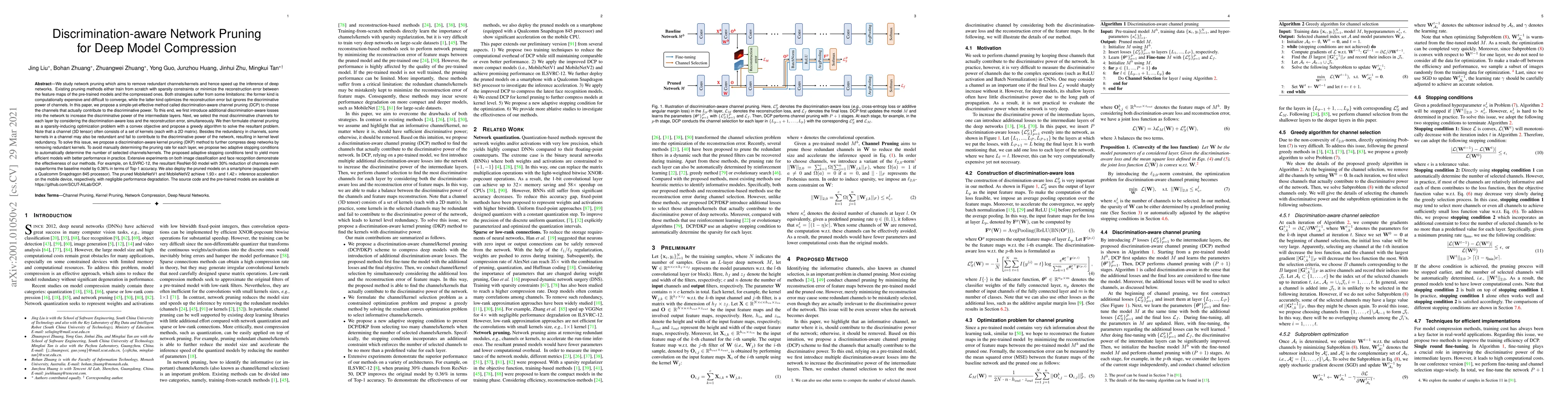 This paper proposes discrimination-aware network pruning methods (DCP and DKP) to efficiently compress deep networks by removing redundant channels and kernels while preserving discriminative power. The adaptive stopping condition helps determine optimal model sizes, resulting in better performance and significant inference speedups.