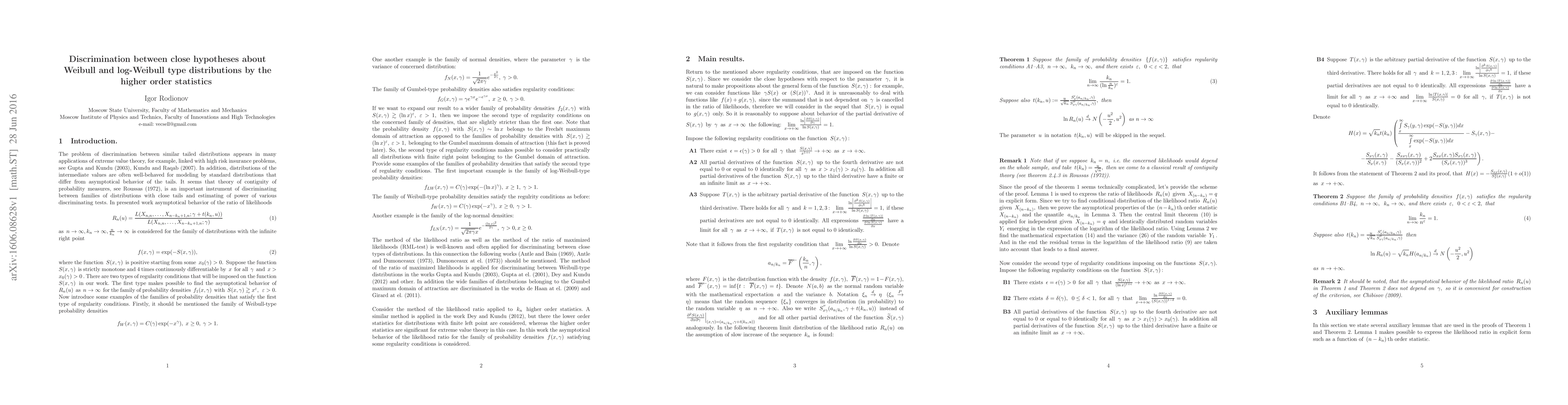 The proposed paper discusses the problem of discrimination between close hypotheses about distributions belonging to the Gumbel maximum domain of attraction. The distinctive feature of the proposed work is using only k higher order statistics of the sample in the construction of criteria, because there are many situations when we do not know the whole sample, as it occurs in the problems linked with safety, life span, catastrofes, sea level and other. This work is the first in the series of the author's works that deal with the statistics of extrema.