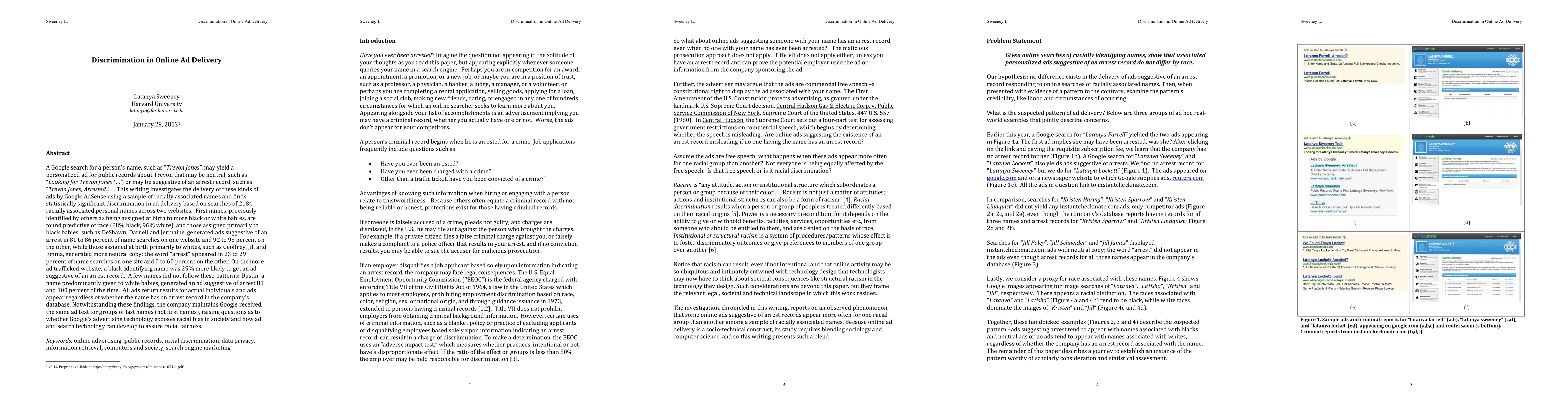 This study investigates racial discrimination in Google AdSense ad delivery, finding significant bias based on racially associated names. Black-identifying names were more likely to receive ads suggestive of arrest, while white-identifying names received more neutral ads, raising concerns about racial bias in Google's ad technology.