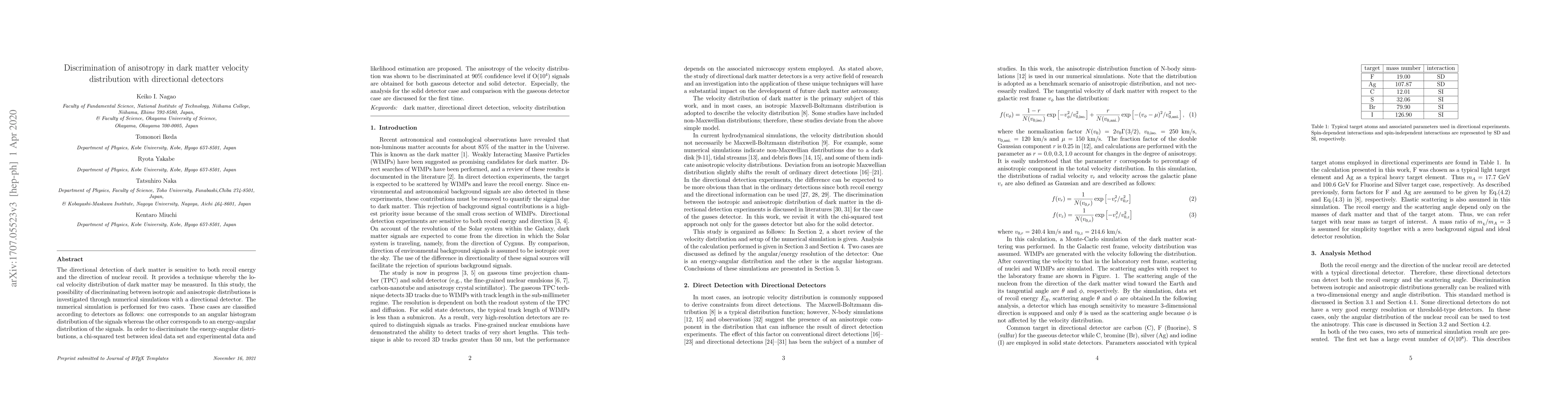 Directional detection of dark matter has sensitivity for both recoil energy and direction of nuclear recoil. It opens the way to measure local velocity distribution of dark matter. In this paper, we study possibility to discriminate isotropic distribution and anisotropic one suggested by a N-body simulation with directional detector. Numerical simulation is performed for two cases according to the detectors, one corresponds to angular histogram and the other is energy-angular distribution of the signals. We reveal that the anisotropy of velocity distribution can be discriminated at 90% C.L. with chi-squared test if O($10^4$) signals are obtained.