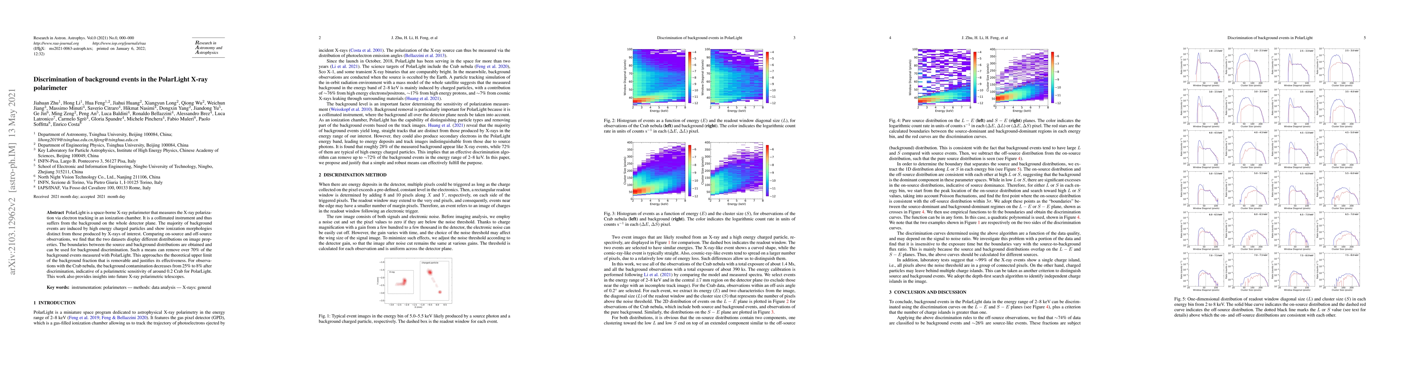 The research employs a discrimination method using the PolarLight X-ray polarimeter, which involves analyzing event images based on energy (E), readout window diagonal size (L), and cluster size (S) to distinguish between X-ray and background events. The method utilizes discrimination curves on L-E and S-E planes, along with criteria on the number of charge islands in the image.