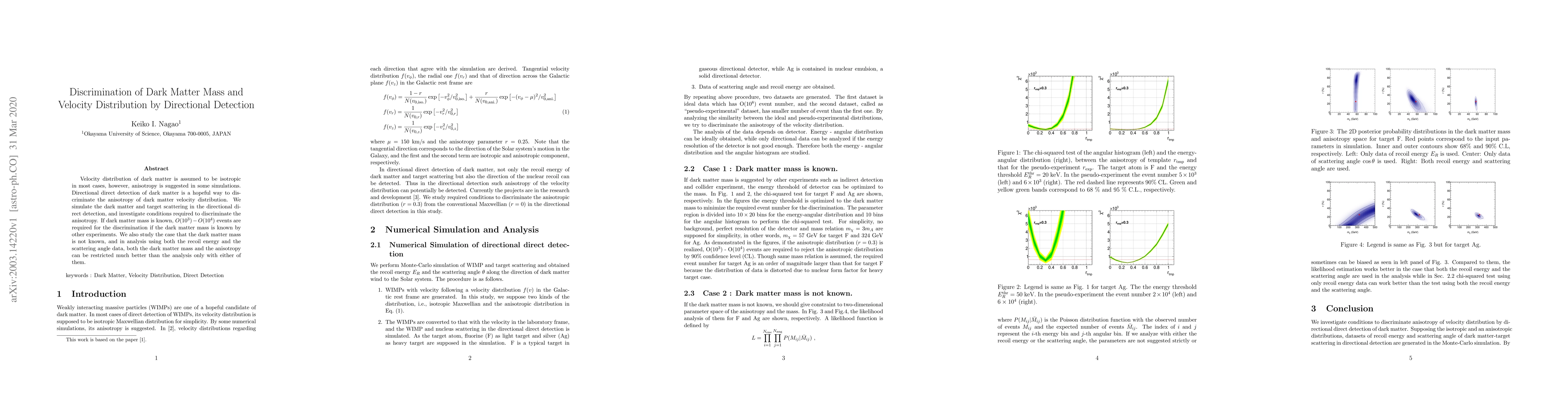 Velocity distribution of dark matter is assumed to be isotropic in most cases, however, anisotropy is suggested in some simulations. Directional direct detection of dark matter is a hopeful way to discriminate the anisotropy of dark matter velocity distribution. We simulate the dark matter and target scattering in the directional direct detection, and investigate conditions required to discriminate the anisotropy. If dark matter mass is known, $O(10^3)-O(10^4)$ events are required for the discrimination if the dark matter mass is known by other experiments. We also study the case that the dark matter mass is not known, and in analysis using both the recoil energy and the scattering angle data, both the dark matter mass and the anisotropy can be restricted much better than the analysis only with either of them.