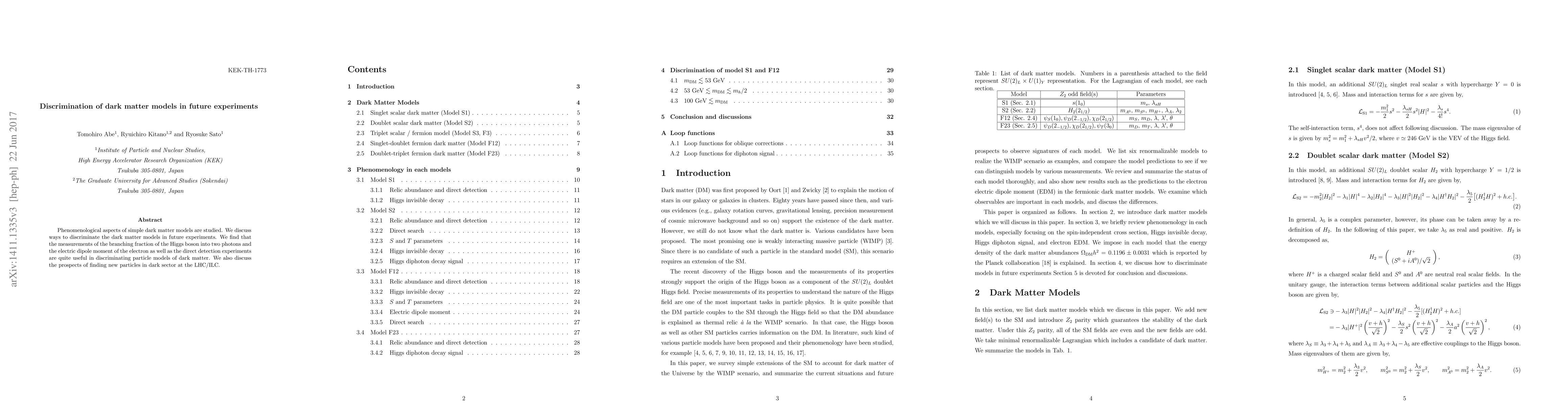 Phenomenological aspects of simple dark matter models are studied. We discuss ways to discriminate the dark matter models in future experiments. We find that the measurements of the branching fraction of the Higgs boson into two photons and the electric dipole moment of the electron as well as the direct detection experiments are quite useful in discriminating particle models of dark matter. We also discuss the prospects of finding new particles in dark sector at the LHC/ILC.