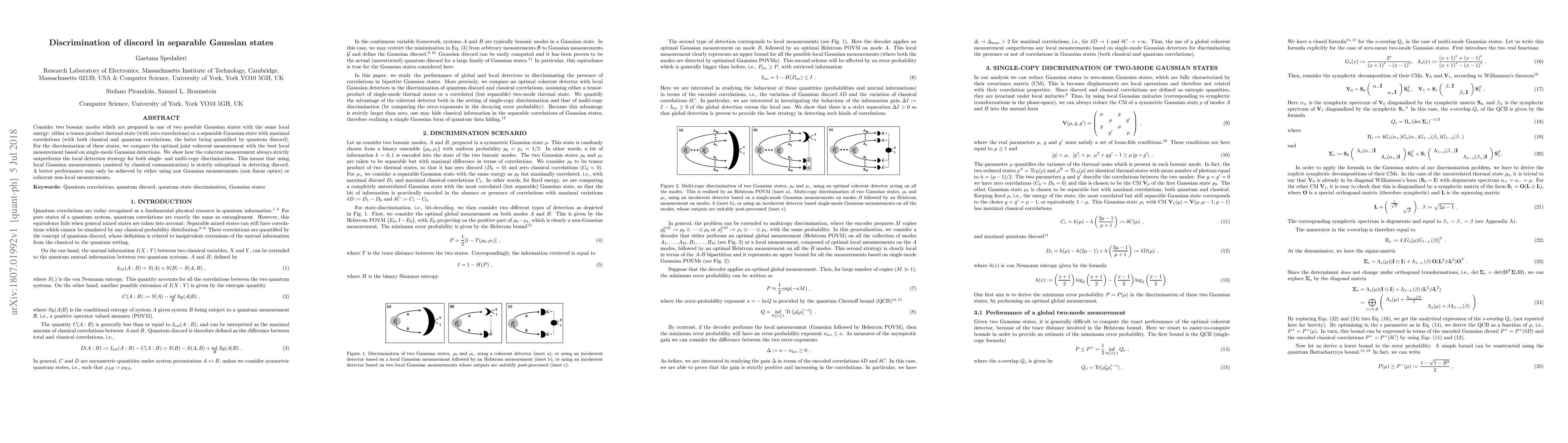 This paper investigates the discrimination between Gaussian states with zero correlations and those with maximal quantum discord in two bosonic modes. It finds that optimal joint coherent measurements outperform local Gaussian detections, indicating that local measurements are suboptimal for detecting discord.