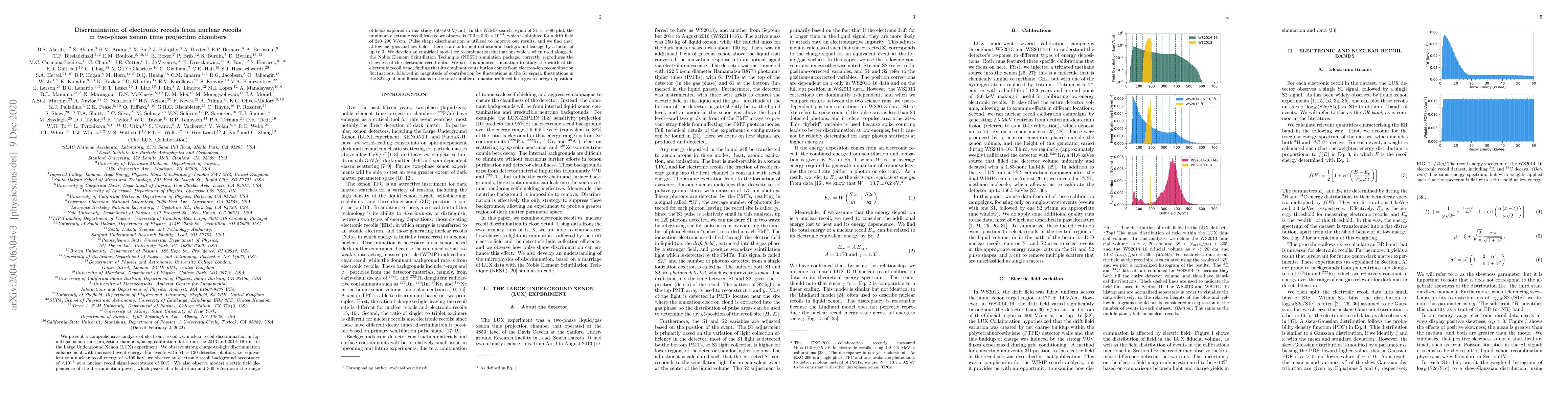 This paper details the discrimination of electronic recoils from nuclear recoils in two-phase xenon time projection chambers using data from the LUX experiment. The study finds strong charge-to-light discrimination enhancement with increased event energy, achieving an electronic recoil background acceptance of less than $10^{-5}$ at a nuclear recoil signal acceptance of 50%.