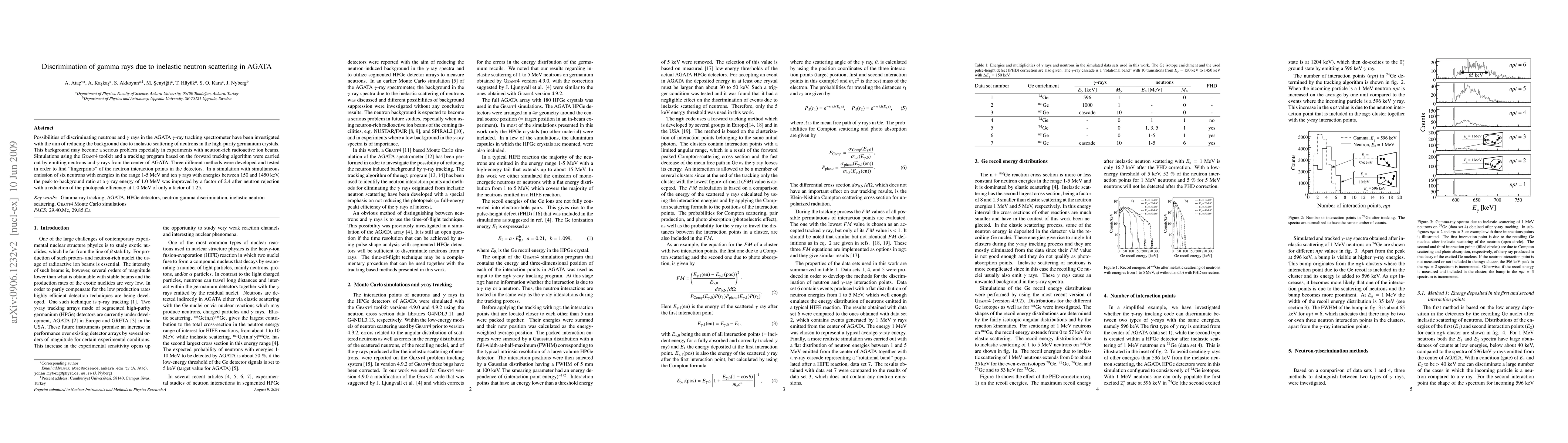 Possibilities of discriminating neutrons and gamma rays in the AGATA gamma-ray tracking spectrometer have been investigated with the aim of reducing the background due to inelastic scattering of neutrons in the high-purity germanium crystals. This background may become a serious problem especially in experiments with neutron-rich radioactive ion beams. Simulations using the Geant4 toolkit and a tracking program based on the forward tracking algorithm were carried out by emitting neutrons and gamma rays from the center of AGATA. Three different methods were developed and tested in order to find 'fingerprints' of the neutron interaction points in the detectors. In a simulation with simultaneous emission of six neutrons with energies in the range 1-5 MeV and ten gamma rays with energies between 150 and 1450 keV, the peak-to-background ratio at a gamma-ray energy of 1.0 MeV was improved by a factor of 2.4 after neutron rejection with a reduction of the photopeak efficiency at 1.0 MeV of only a factor of 1.25.