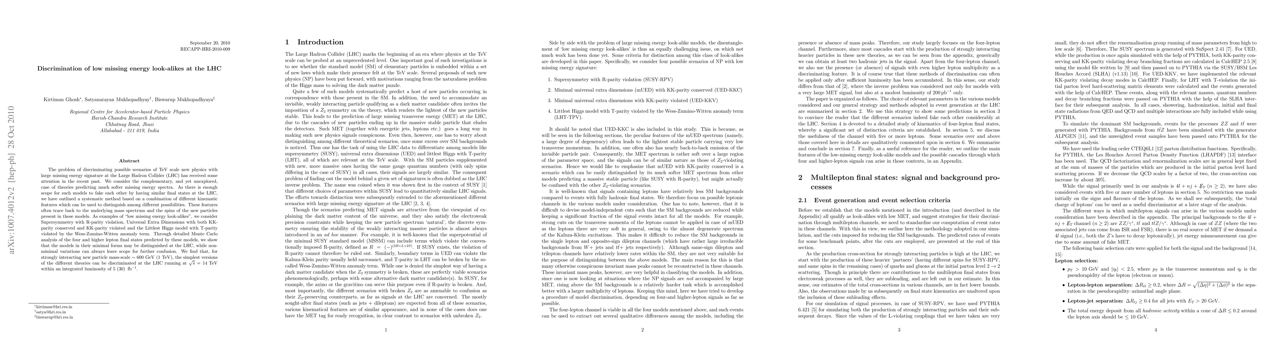 The problem of discriminating possible scenarios of TeV scale new physics with large missing energy signature at the Large Hadron Collider (LHC) has received some attention in the recent past. We consider the complementary, and yet unexplored, case of theories predicting much softer missing energy spectra. As there is enough scope for such models to fake each other by having similar final states at the LHC, we have outlined a systematic method based on a combination of different kinematic features which can be used to distinguish among different possibilities. These features often trace back to the underlying mass spectrum and the spins of the new particles present in these models. As examples of "low missing energy look-alikes", we consider Supersymmetry with R-parity violation, Universal Extra Dimensions with both KK-parity conserved and KK-parity violated and the Littlest Higgs model with T-parity violated by the Wess-Zumino-Witten anomaly term. Through detailed Monte Carlo analysis of the four and higher lepton final states predicted by these models, we show that the models in their minimal forms may be distinguished at the LHC, while non-minimal variations can always leave scope for further confusion. We find that, for strongly interacting new particle mass-scale ~600 GeV (1 TeV), the simplest versions of the different theories can be discriminated at the LHC running at sqrt{s}=14 TeV within an integrated luminosity of 5 (30) fb^{-1}.