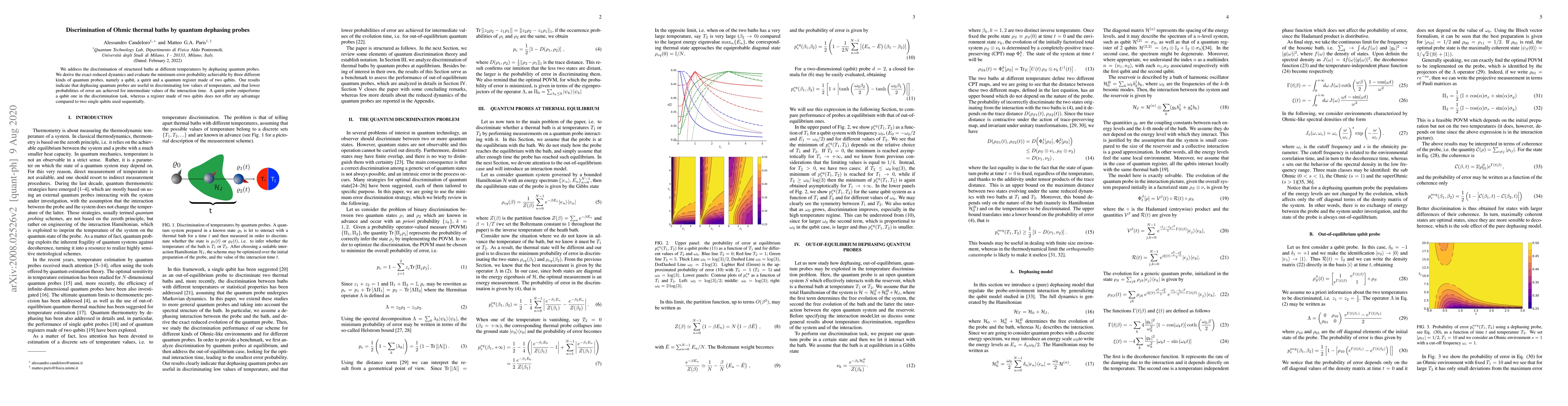 We address the discrimination of structured baths at different temperatures by dephasing quantum probes. We derive the exact reduced dynamics and evaluate the minimum error probability achievable by three different kinds of quantum probes, namely a qubit, a qutrit and a quantum register made of two qubits. Our results indicate that dephasing quantum probes are useful in discriminating low values of temperature, and that lower probabilities of error are achieved for intermediate values of the interaction time. A qutrit probe outperforms a qubit one in the discrimination task, whereas a register made of two qubits does not offer any advantage compared to two single qubits used sequentially.