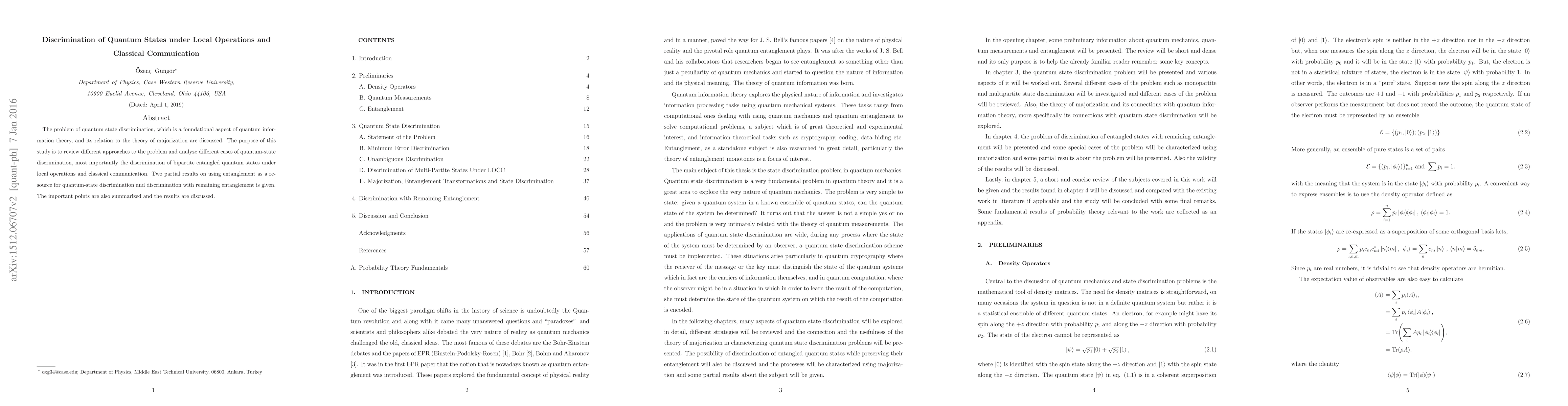 The problem of quantum state discrimination, which is a foundational aspect of quantum information theory, and its relation to the theory of majorization are discussed. The purpose of this study is to review different approaches to the problem and analyze different cases of quantum-state discrimination, most importantly the discrimination of bipartite entangled quantum states under local operations and classical communication. Two partial results on using entanglement as a resource for quantum-state discrimination and discrimination with remaining entanglement is given. The important points are also summarized and the results are discussed.