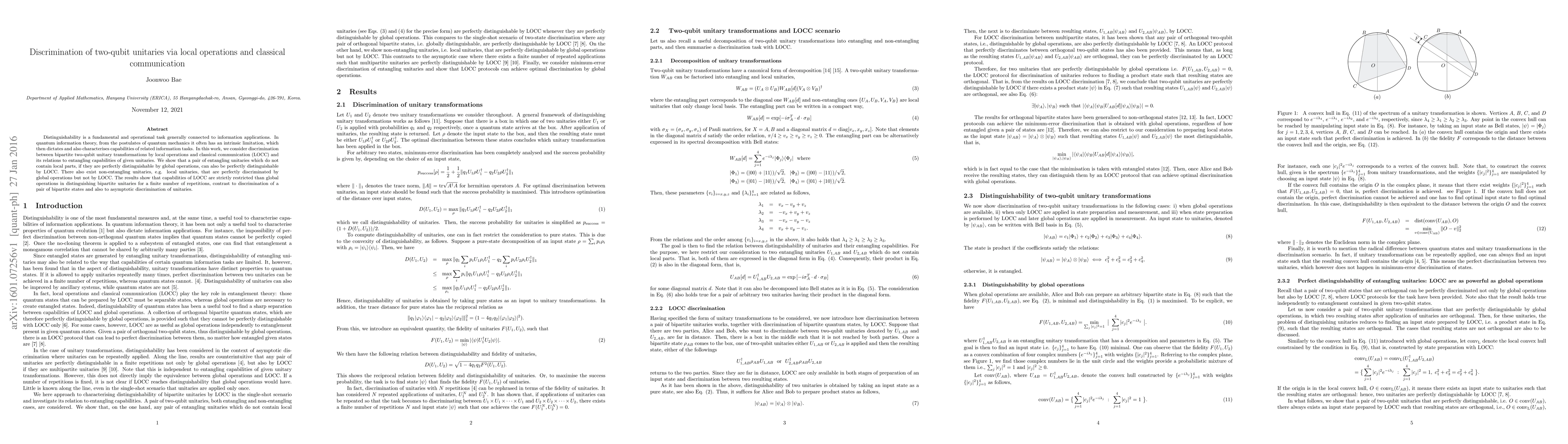 This paper investigates the distinguishability of two-qubit unitary transformations using local operations and classical communication (LOCC). It finds that entangling unitaries perfectly distinguishable by global operations can also be so by LOCC, while non-entangling unitaries, like local unitaries, cannot be perfectly discriminated by LOCC despite being distinguishable globally.