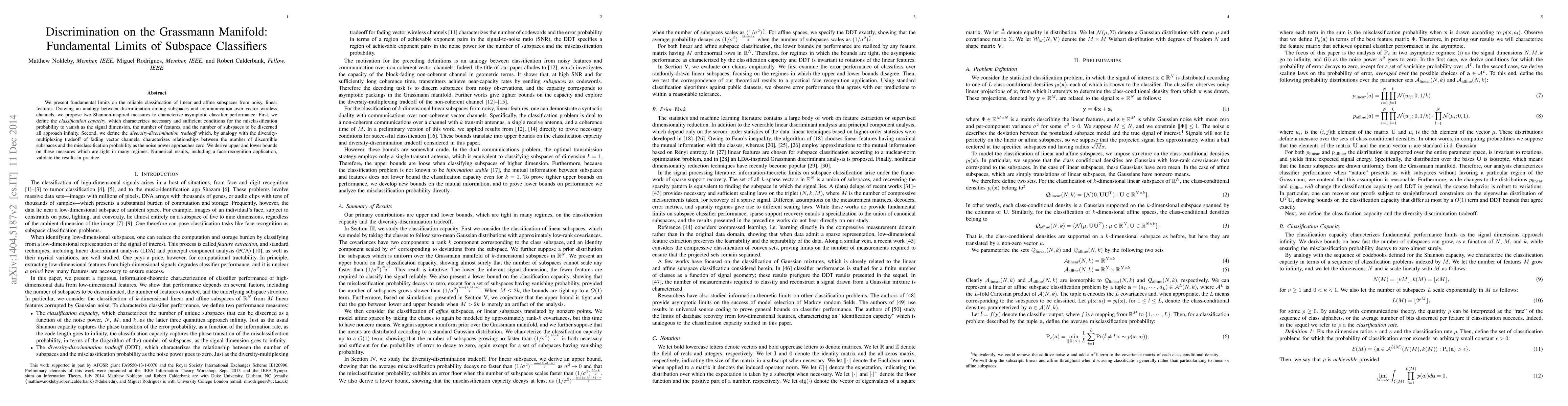 We present fundamental limits on the reliable classification of linear and affine subspaces from noisy, linear features. Drawing an analogy between discrimination among subspaces and communication over vector wireless channels, we propose two Shannon-inspired measures to characterize asymptotic classifier performance. First, we define the classification capacity, which characterizes necessary and sufficient conditions for the misclassification probability to vanish as the signal dimension, the number of features, and the number of subspaces to be discerned all approach infinity. Second, we define the diversity-discrimination tradeoff which, by analogy with the diversity-multiplexing tradeoff of fading vector channels, characterizes relationships between the number of discernible subspaces and the misclassification probability as the noise power approaches zero. We derive upper and lower bounds on these measures which are tight in many regimes. Numerical results, including a face recognition application, validate the results in practice.