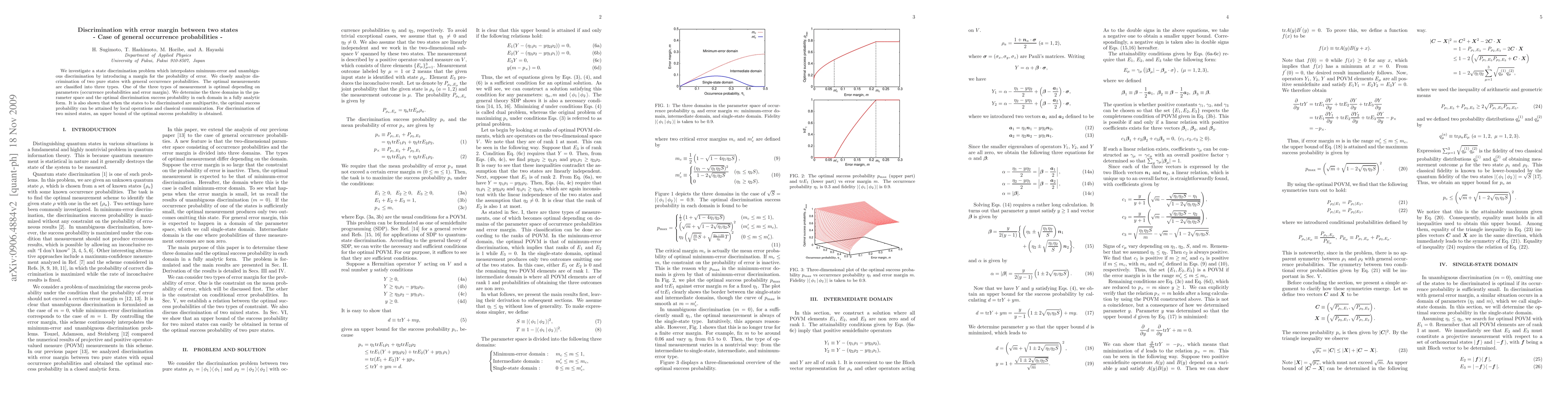 This paper investigates optimal discrimination between two pure quantum states with general occurrence probabilities, introducing a margin for the probability of error. The authors classify optimal measurements into three types and determine the success probability domains and optimal success probability in each analytically. They also show that for multipartite states, optimal discrimination can be achieved through local operations and classical communication. An upper bound for the optimal success probability is derived for mixed states.