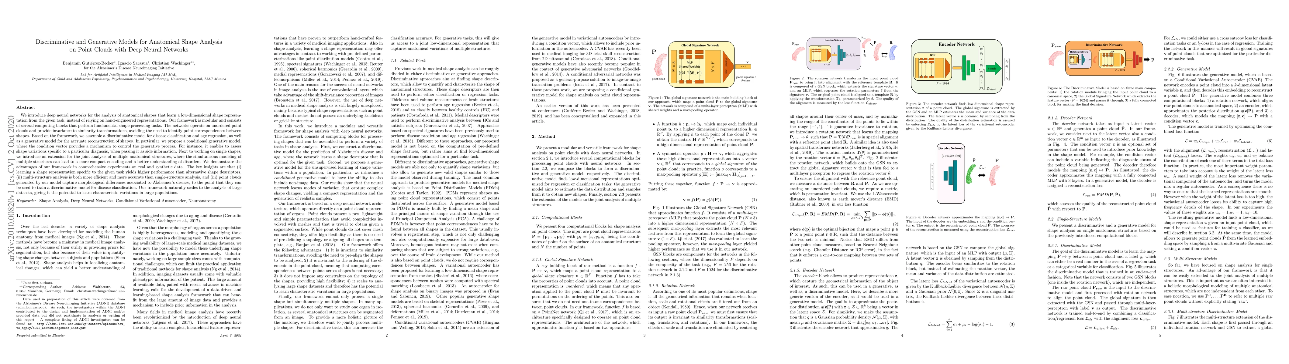 We introduce deep neural networks for the analysis of anatomical shapes that learn a low-dimensional shape representation from the given task, instead of relying on hand-engineered representations. Our framework is modular and consists of several computing blocks that perform fundamental shape processing tasks. The networks operate on unordered point clouds and provide invariance to similarity transformations, avoiding the need to identify point correspondences between shapes. Based on the framework, we assemble a discriminative model for disease classification and age regression, as well as a generative model for the accruate reconstruction of shapes. In particular, we propose a conditional generative model, where the condition vector provides a mechanism to control the generative process. instance, it enables to assess shape variations specific to a particular diagnosis, when passing it as side information. Next to working on single shapes, we introduce an extension for the joint analysis of multiple anatomical structures, where the simultaneous modeling of multiple structures can lead to a more compact encoding and a better understanding of disorders. We demonstrate the advantages of our framework in comprehensive experiments on real and synthetic data. The key insights are that (i) learning a shape representation specific to the given task yields higher performance than alternative shape descriptors, (ii) multi-structure analysis is both more efficient and more accurate than single-structure analysis, and (iii) point clouds generated by our model capture morphological differences associated to Alzheimers disease, to the point that they can be used to train a discriminative model for disease classification. Our framework naturally scales to the analysis of large datasets, giving it the potential to learn characteristic variations in large populations.