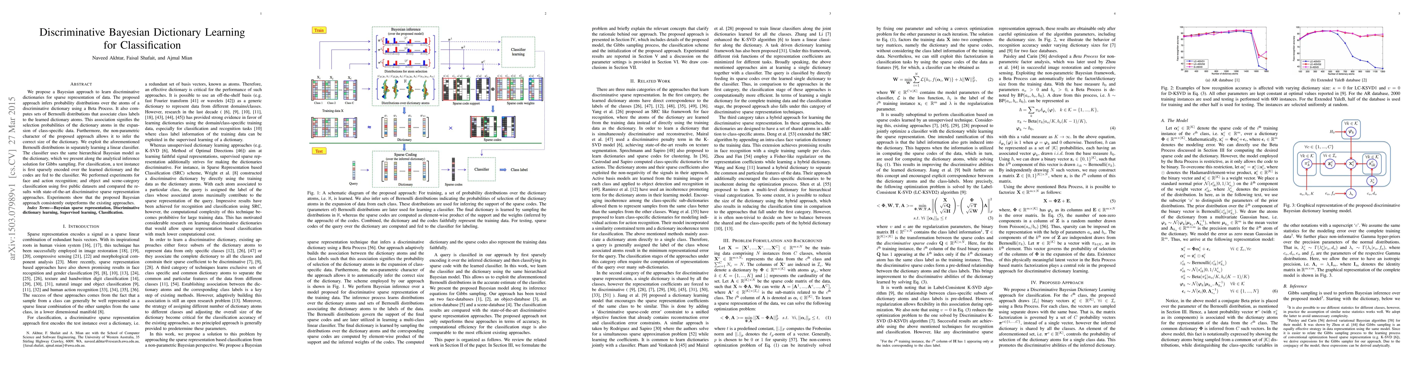 This paper proposes a Bayesian method for discriminative dictionary learning that uses a Beta Process to infer probability distributions over dictionary atoms and Bernoulli distributions to associate class labels. The method is shown to outperform existing approaches in face and action recognition, as well as object and scene-category classification tasks.