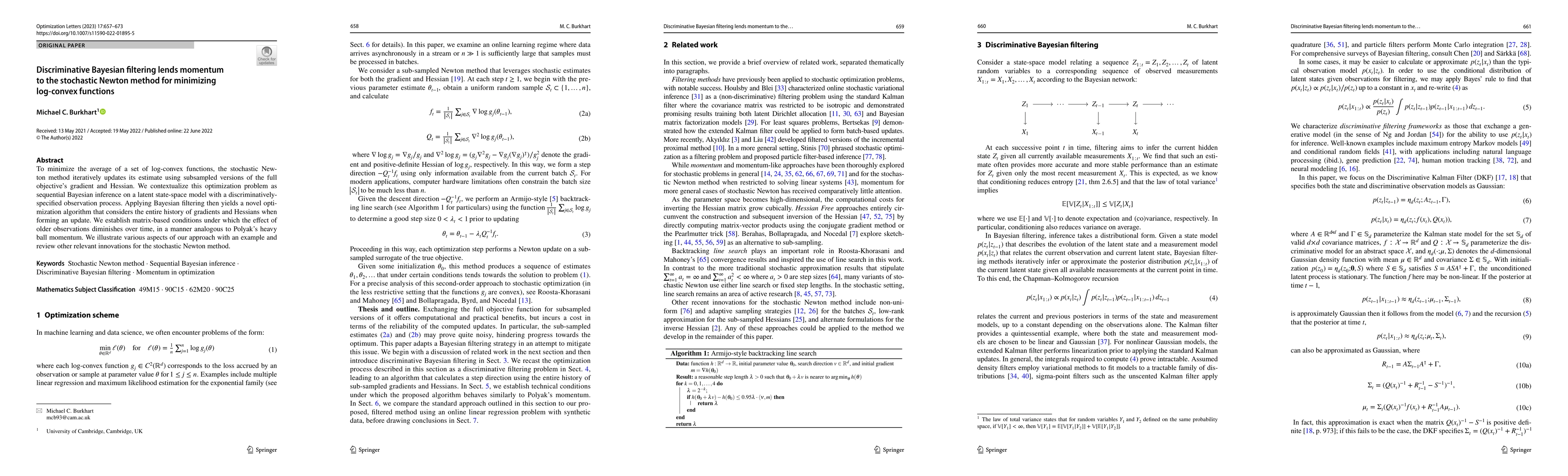 This paper proposes a new optimization algorithm for minimizing the average of log-convex functions by framing the stochastic Newton method within a Bayesian filtering framework. The approach leverages discriminative Bayesian filtering to incorporate the entire history of gradient and Hessian updates, analogous to Polyak's heavy ball momentum, and establishes conditions for diminishing older observations' influence.
