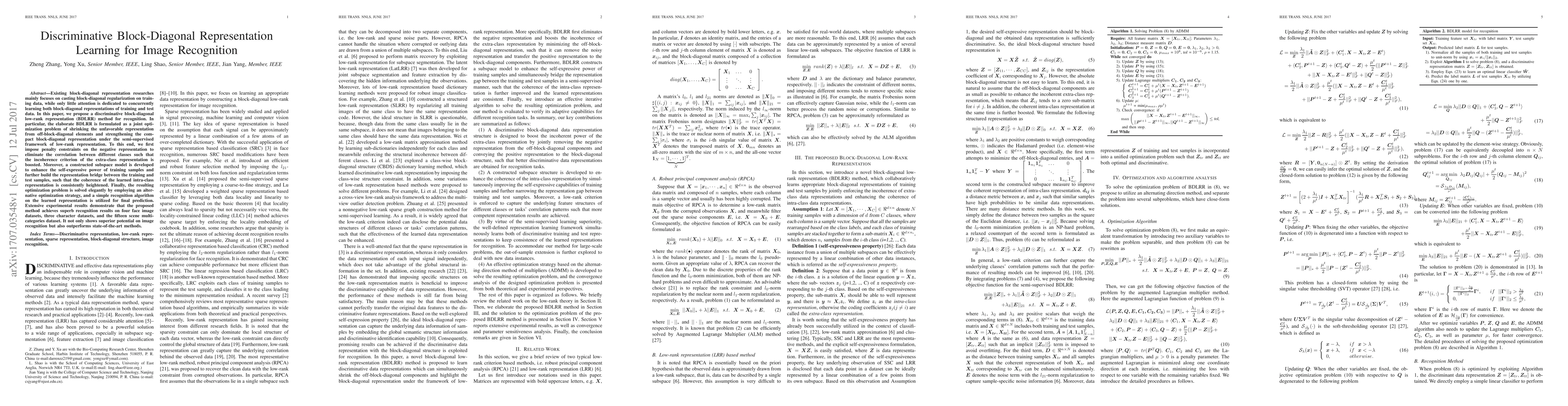 This paper introduces a discriminative block-diagonal low-rank representation (BDLRR) method for image recognition, focusing on learning both training and test data representations. The proposed method optimizes to eliminate unfavorable off-block-diagonal elements and strengthen intra-class block-diagonal representations, achieving superior recognition results on multiple datasets.