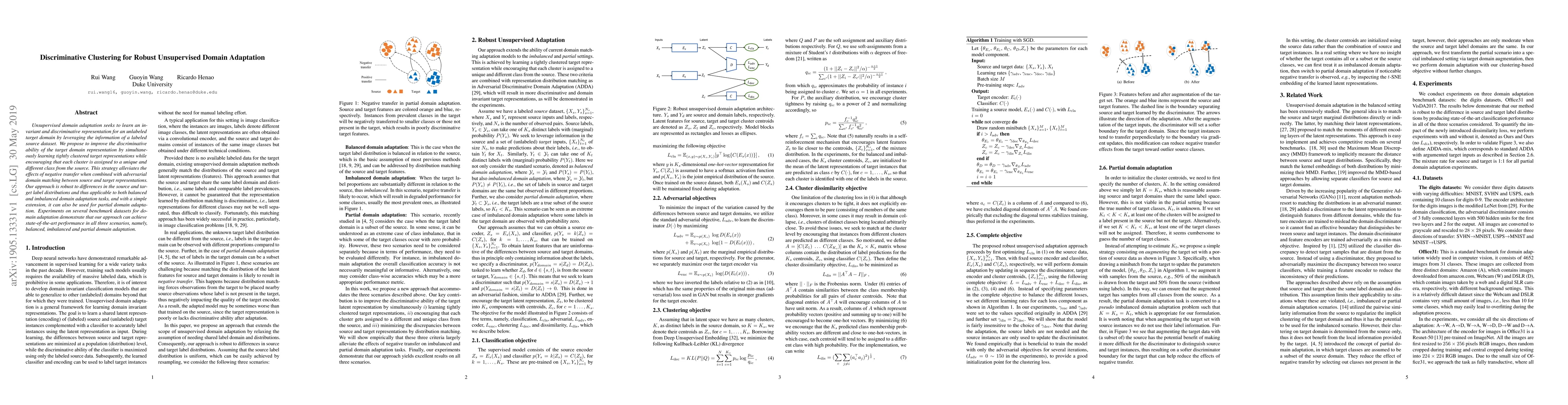 Unsupervised domain adaptation seeks to learn an invariant and discriminative representation for an unlabeled target domain by leveraging the information of a labeled source dataset. We propose to improve the discriminative ability of the target domain representation by simultaneously learning tightly clustered target representations while encouraging that each cluster is assigned to a unique and different class from the source. This strategy alleviates the effects of negative transfer when combined with adversarial domain matching between source and target representations. Our approach is robust to differences in the source and target label distributions and thus applicable to both balanced and imbalanced domain adaptation tasks, and with a simple extension, it can also be used for partial domain adaptation. Experiments on several benchmark datasets for domain adaptation demonstrate that our approach can achieve state-of-the-art performance in all three scenarios, namely, balanced, imbalanced and partial domain adaptation.